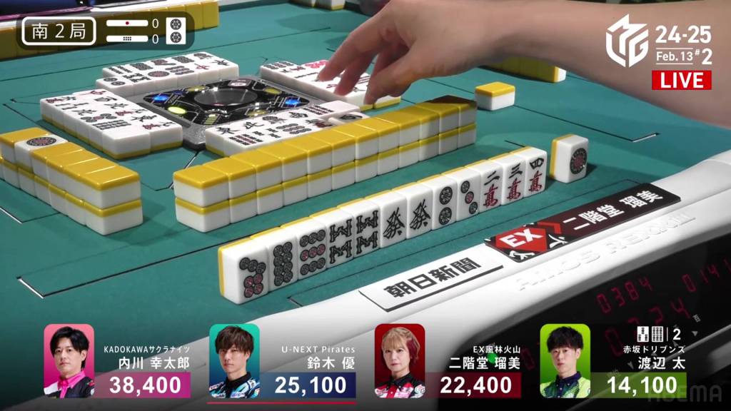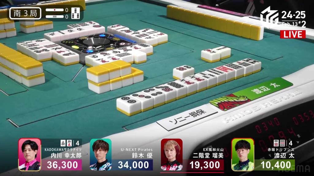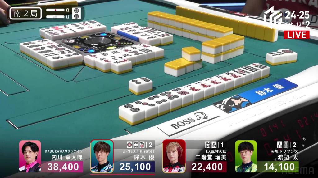 In S2-0, Yu is the dealer in 2nd place and 13,300 behind 1st place Uchikawa.