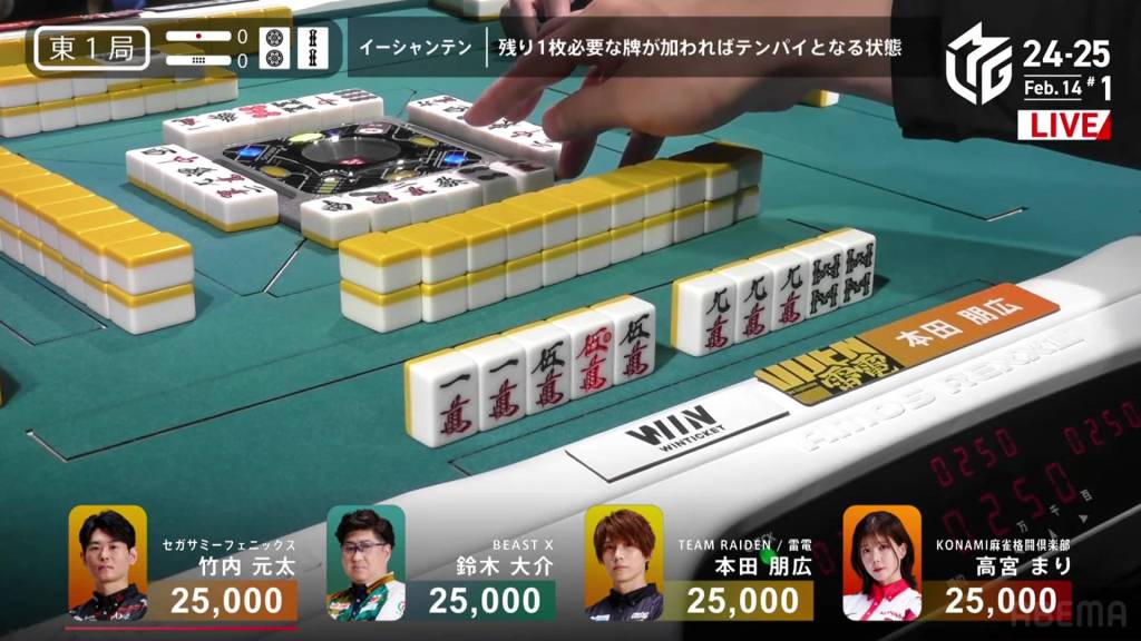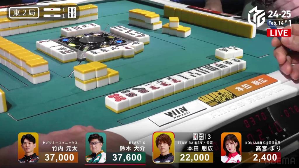 Looking around the table, Honda is at toitoi iishanten and Takamiya has already called twice and has a pair of norths. At the end of Honda’s row, he calls pon on the north and gets to tenpai on a 1m/8s shanpon.