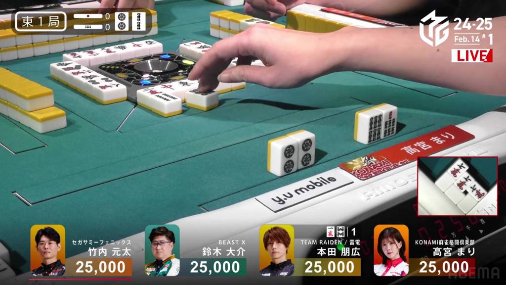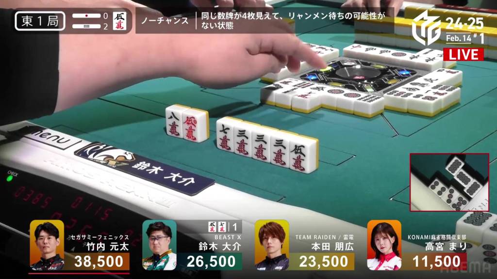 Not wanting to deal in, both Honda and Genta defend. However, 4th place Takamiya is the dealer and has nowhere to go but up. In the middle of the second row, Takamiya gets to tenpai and waits on a 5m tanki. A turn later, she improves to a 147p three-sided wait, not allowed to win on the 1p.