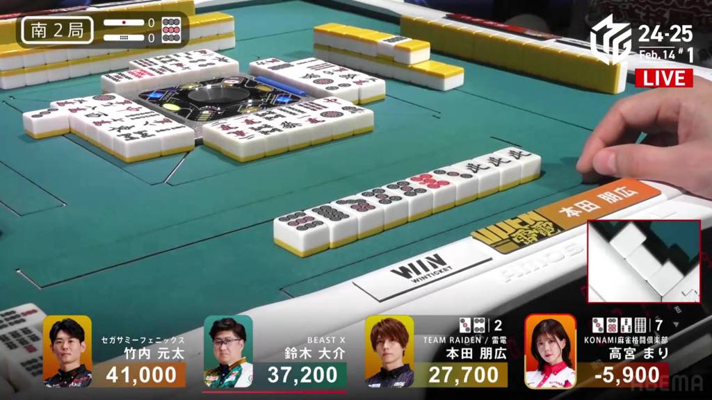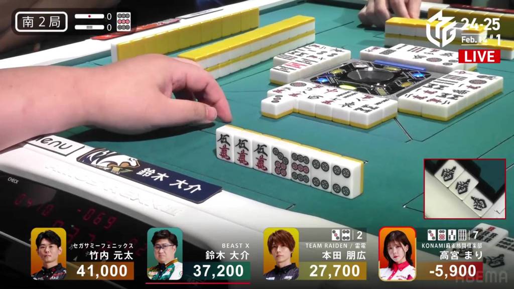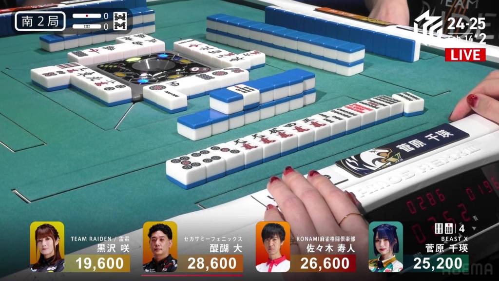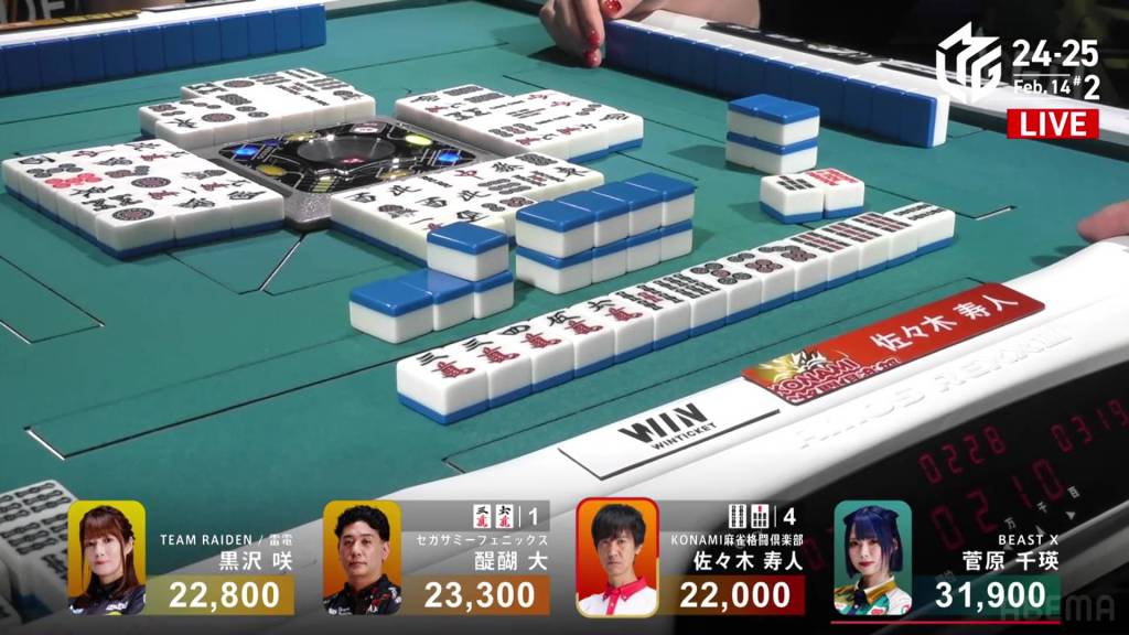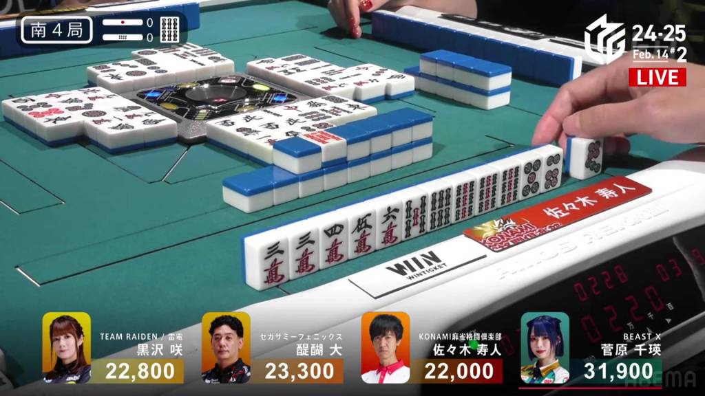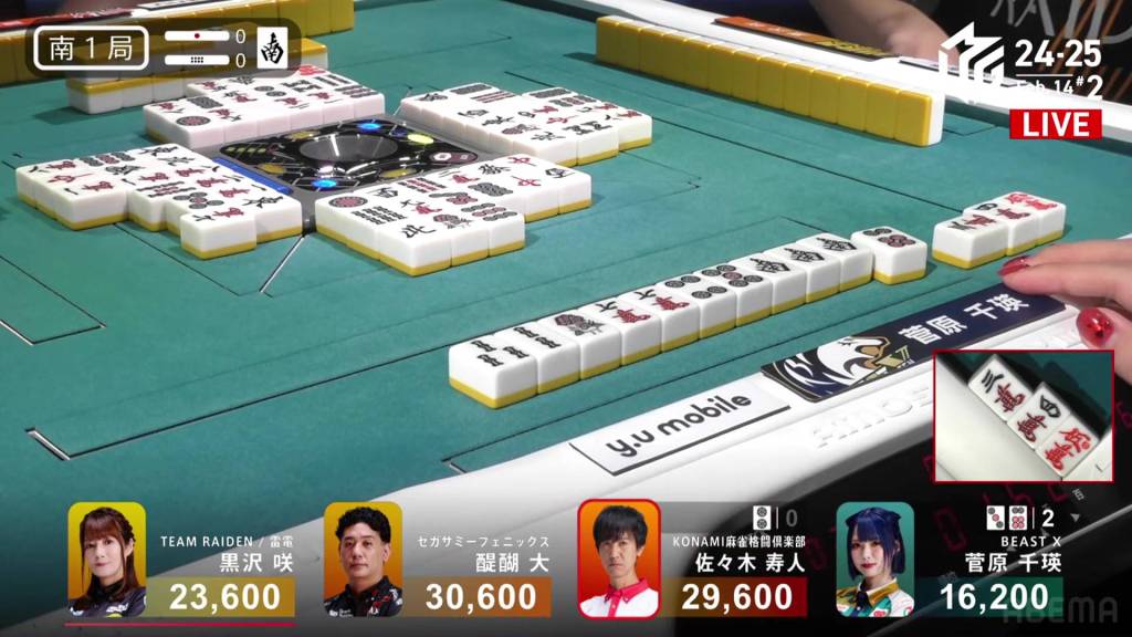 In S2-0, Sugawara is now just 3,400 from 1st place. A 3-han hand will move her up.