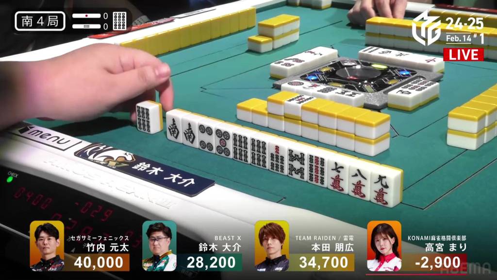 In S4-0, Daisuke is in 3rd place, 6,500 behind 2nd place Honda to take that spot, Daisuke needs a 3/30 direct hit, a 3/40 tsumo (for a tie), or a mangan ron. If he wants to aim higher and go for 1st place that is 11,800, Daisuke will need to hit Genta with a mangan direct hit, or get a haneman.
