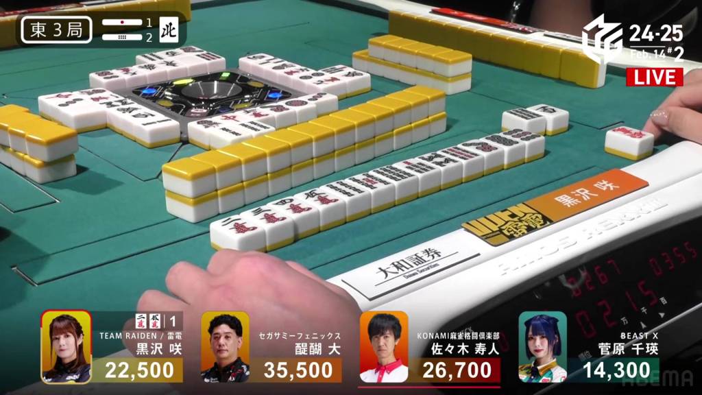 In E3-2, Kurosawa is in 3rd place, 4,200 behind 2nd place dealer Hisato and 13,000 behind 1st place Daigo. 1,600 in bonuses await the next winner.
