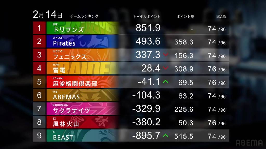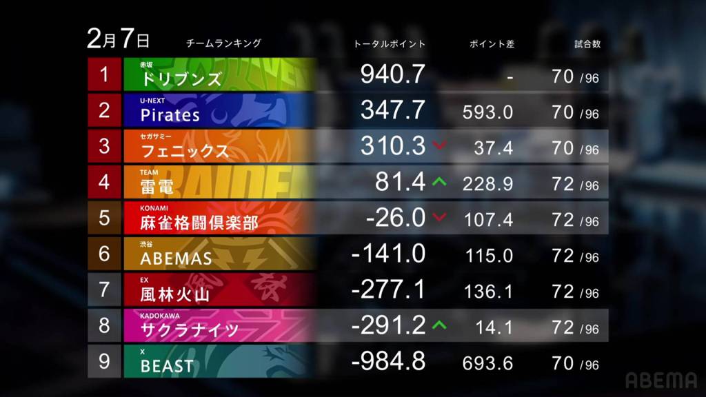 The Beast X, Shibuya Abemas and Sega Sammy Phoenix also gained point this week. The Beast X gained points in every game with three 2nds and a 1st, gaining them +89.1pts this week. The Shibuya Abemas only played two games, but Shiratori’s big 1st place cancelled out Ooi’s 4th place and then some. The Sega Sammy Phoenix avoided 4th place in all their games as Genta got a 1st place and took back his position at the top of the standings.