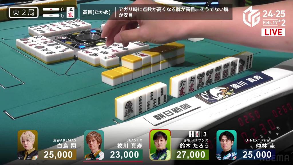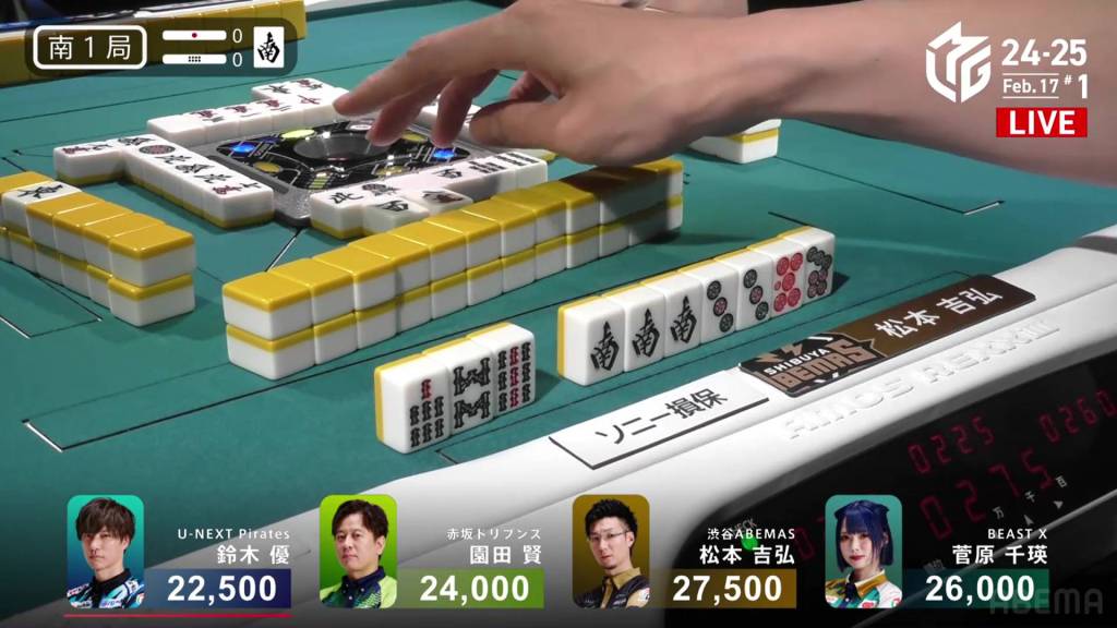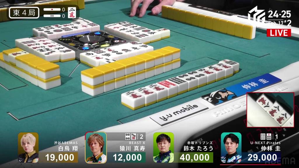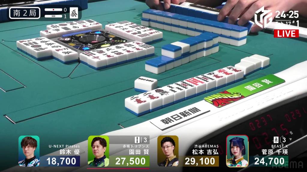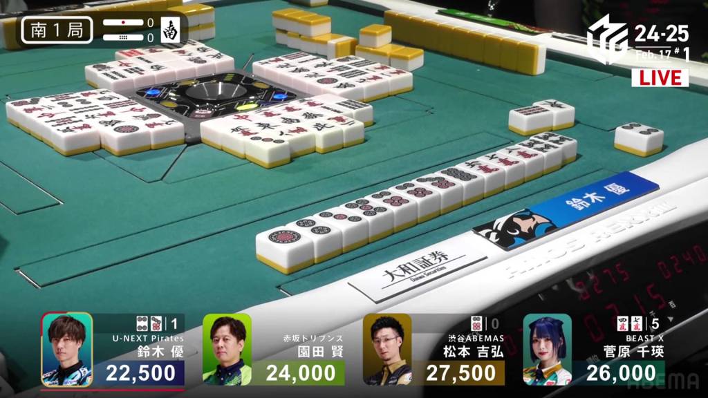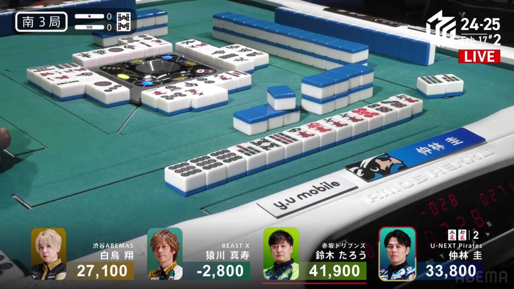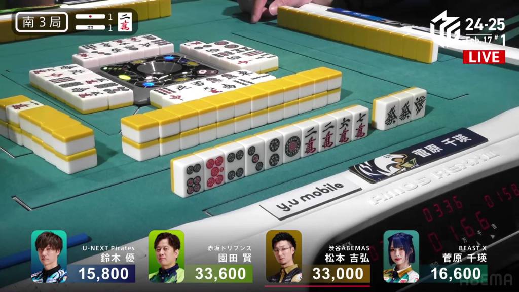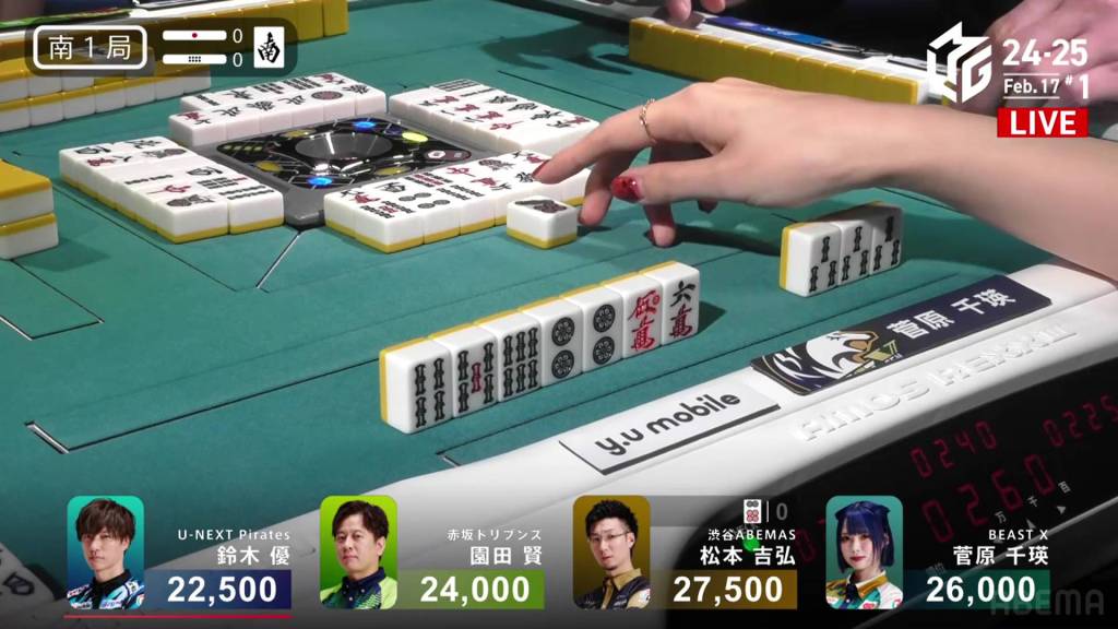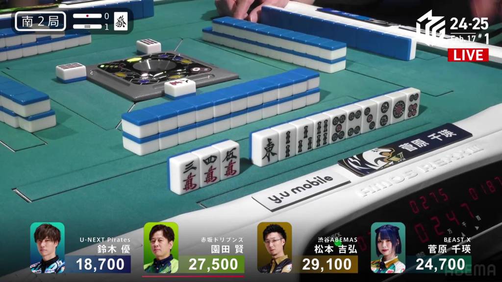 In S1-0, Yu is the dealer in 4th place, but he is just 5,000 behind 1st place Matsumoto. A decent hand can move him up to the top.