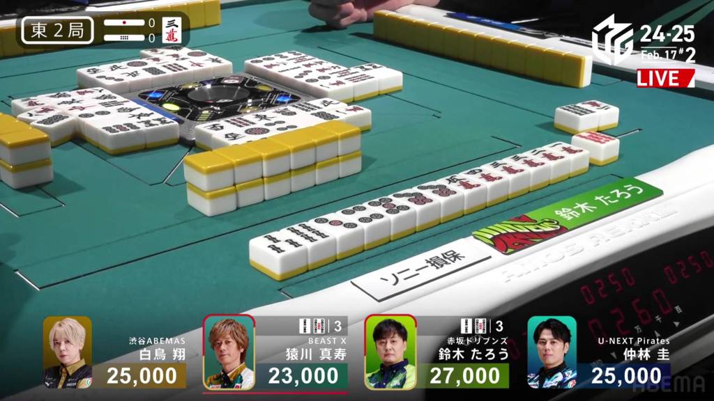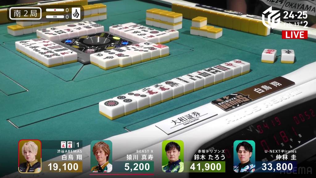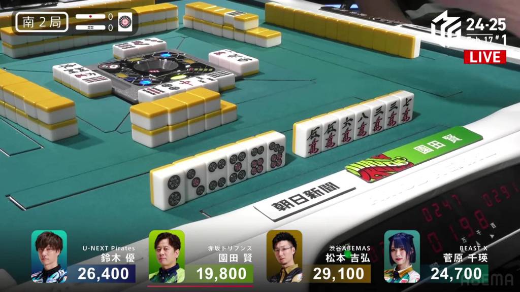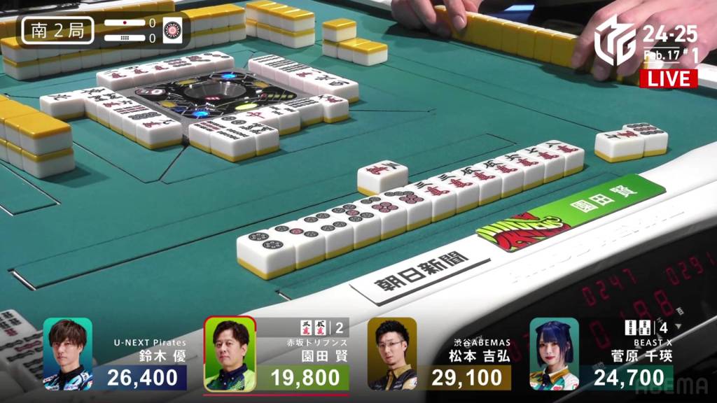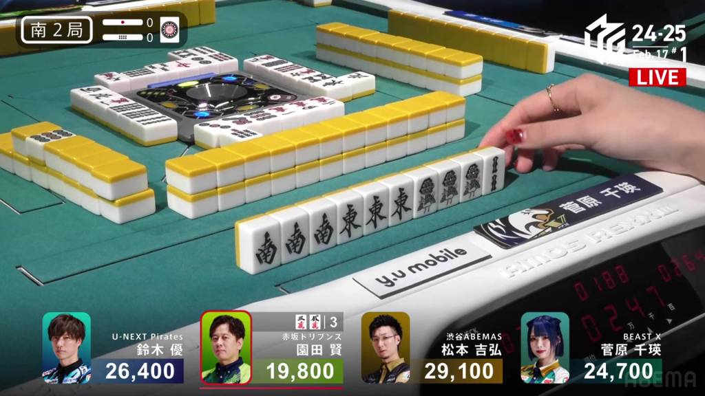 In S2-0 Sonoda is the dealer in 4th place, 4,900 behind 3rd place Sugawara and 6,600 behind 2nd place Yu.