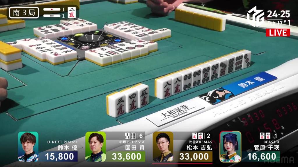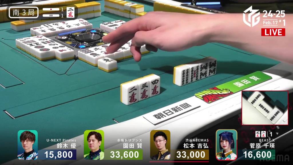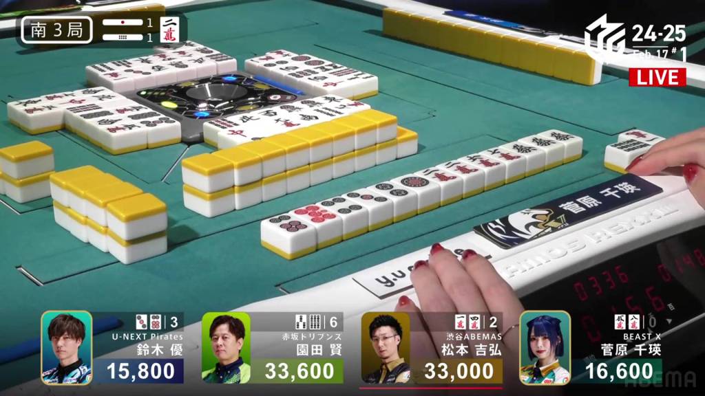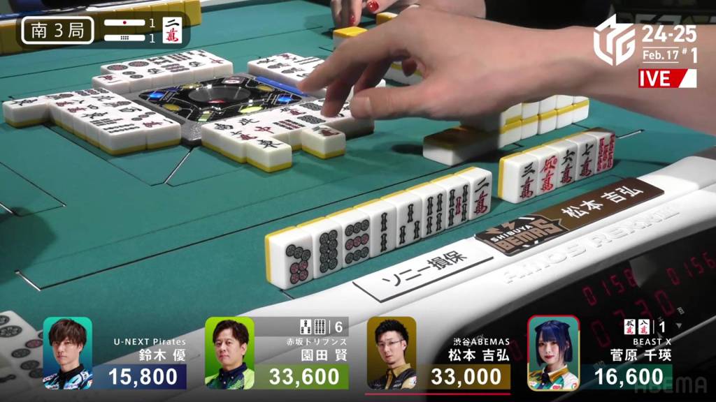 With Sugawara’s discarded 2s, 1st place Sonoda calls pon to get to iishanten. Within the next go-around, he calls a 234p chii and gets to tenpai on a 36s ryanmen.