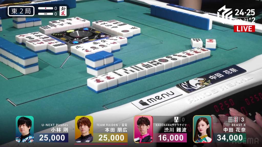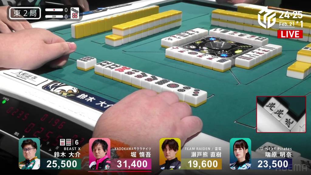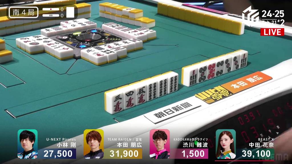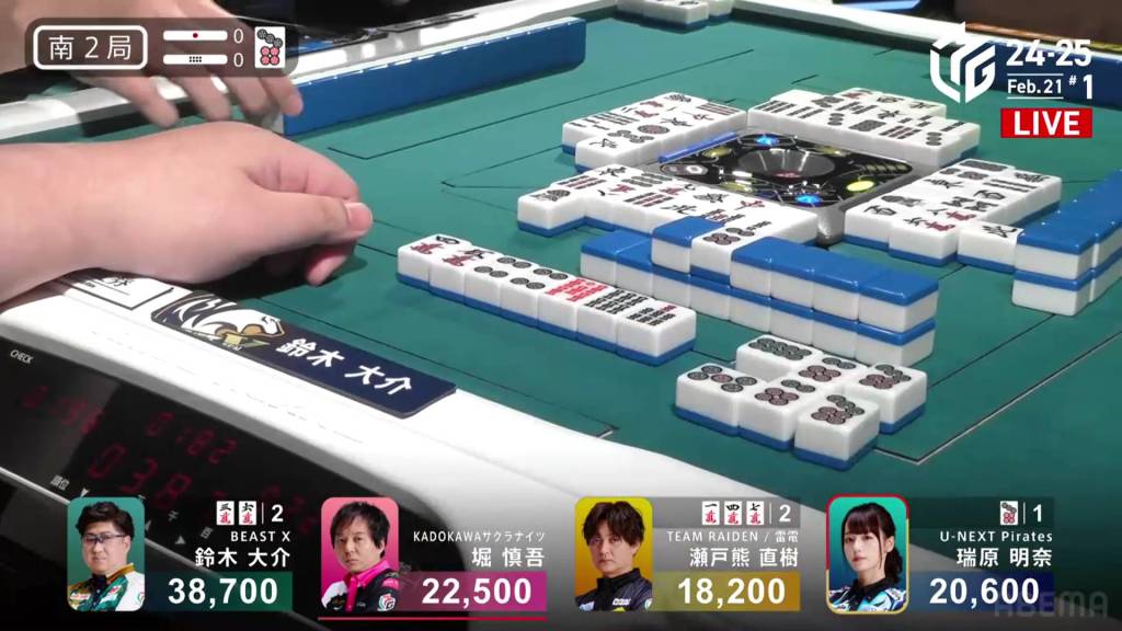 Immediately after, Mizuhara draws and discards the white dragon and deals into Setokuma. Setokuma wins the hand with Riichi/Ippatsu/White Dragon for 5,200, finishing in 3rd place.