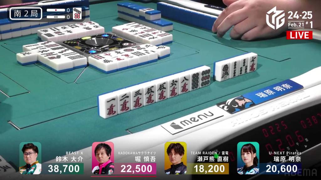 With Mizuhara’s discards south, Setokuma calls pon and waits on a 14m/7m wait.