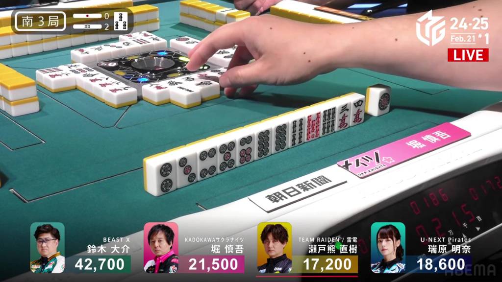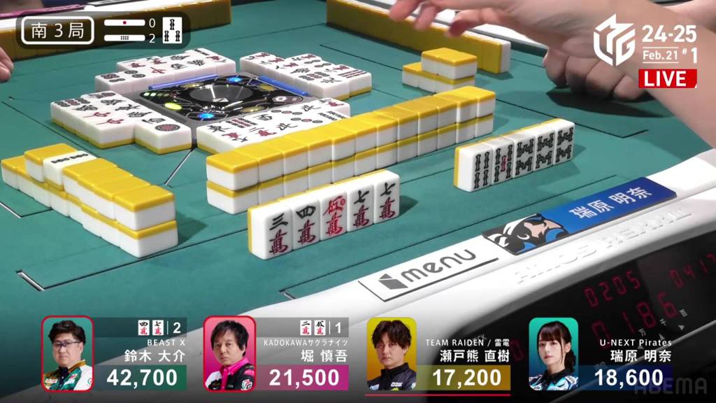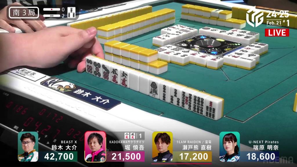 Right after, Daisuke calls a 678p chii and gets to tenpai on a 36m ryanmen, guaranteed a mangan. On Setokuma’s turn, he draws and discards the 3m and deals into Daisuke. Daisuke wins the hand with Tanyao/Dora 2/Aka 1 for 8,000 plus a riichi stick.