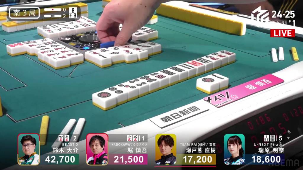 At the start of the second row, Hori draws a red 5s to get to iishanten. With a 1p draw on his next draw, Hori gets to tenpai and calls riichi on a 25m ryanmen.