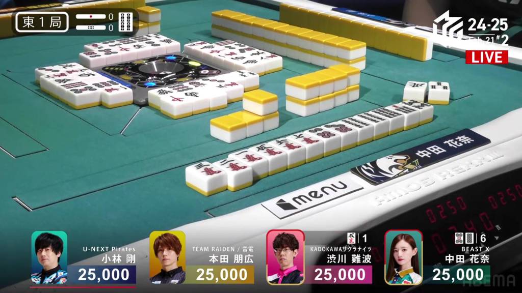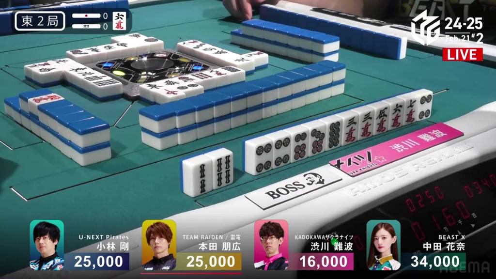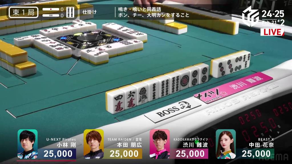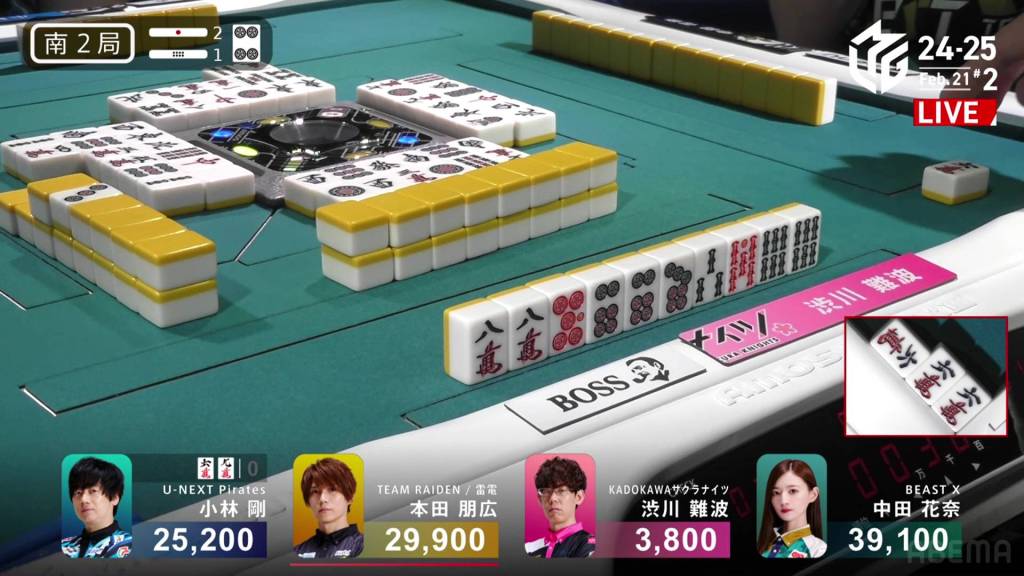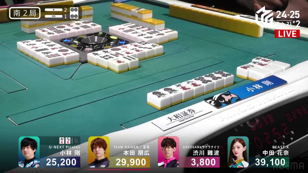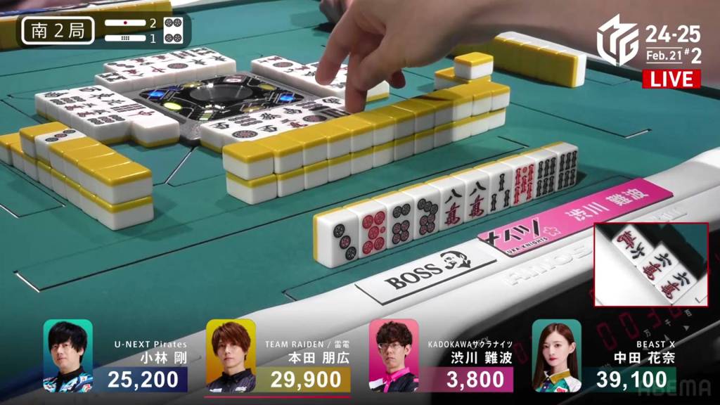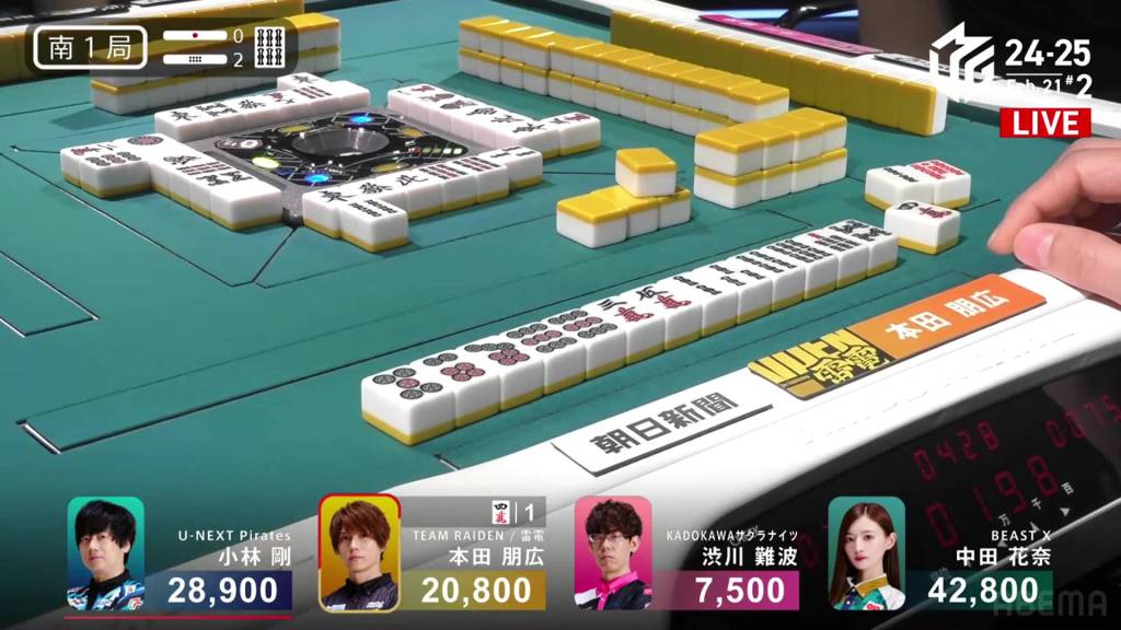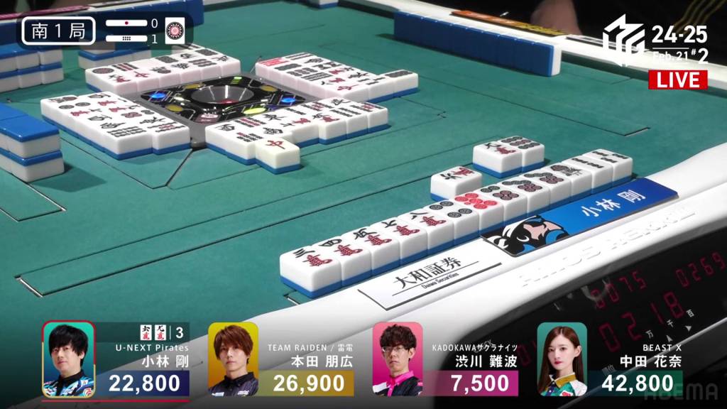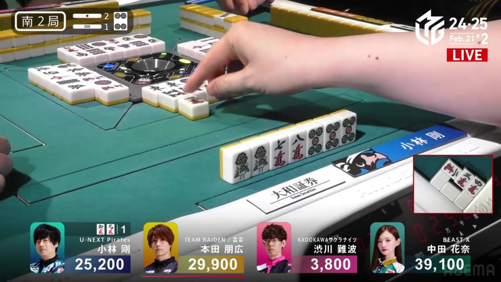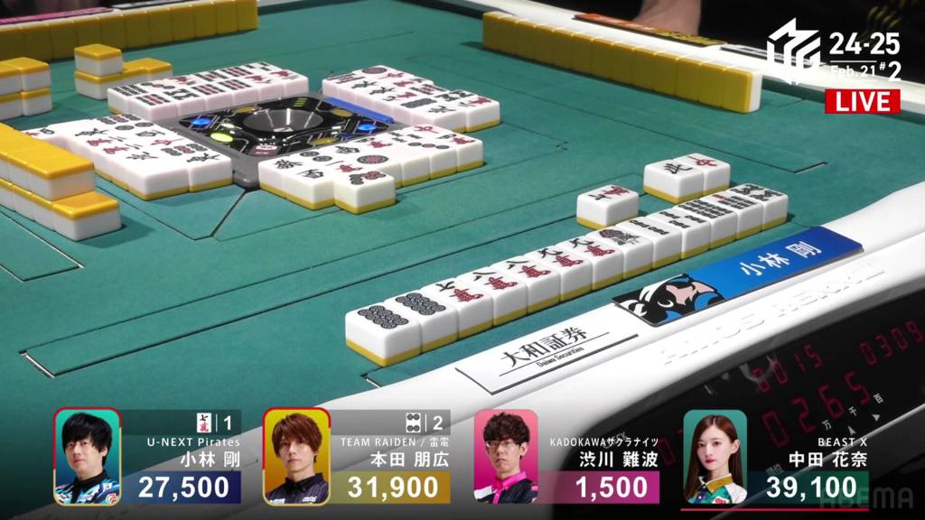 …Kobayashi calls ron, getting the chankan! Kobayashi wins the hand with Chankan/White Dragon for 2,000+300 plus two riichi sticks, the third chankan in M-League history.