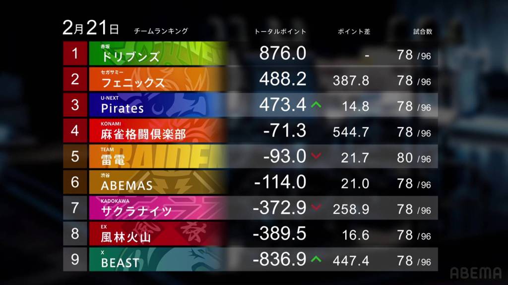 Losing points were the U-Next Pirates, Sega Sammy Phoenix, Kadokawa Sakura Knights and the Beast X. The U-Next Pirates had Mizuhara and Nakabayashi playing in the team’s only two games, but Mizuhara’s 3rd place was very slightly bigger than Nakabayashi’s 2nd, leading to the small loss. The Sega Sammy Phoenix avoided 4th all this week, but they were also unable to get 1st, leading to a 0/2/2/0 record and a -12.6pts drop. The Kadokawa Sakura Knights continue to struggle in 8th place after failing to get 1st and another painful 4th place from Okada. And for the Beast X, Daisuke’s 1st place start was lost two three 4ths in the rest of the week, incluing the double 4th on Friday to end February.