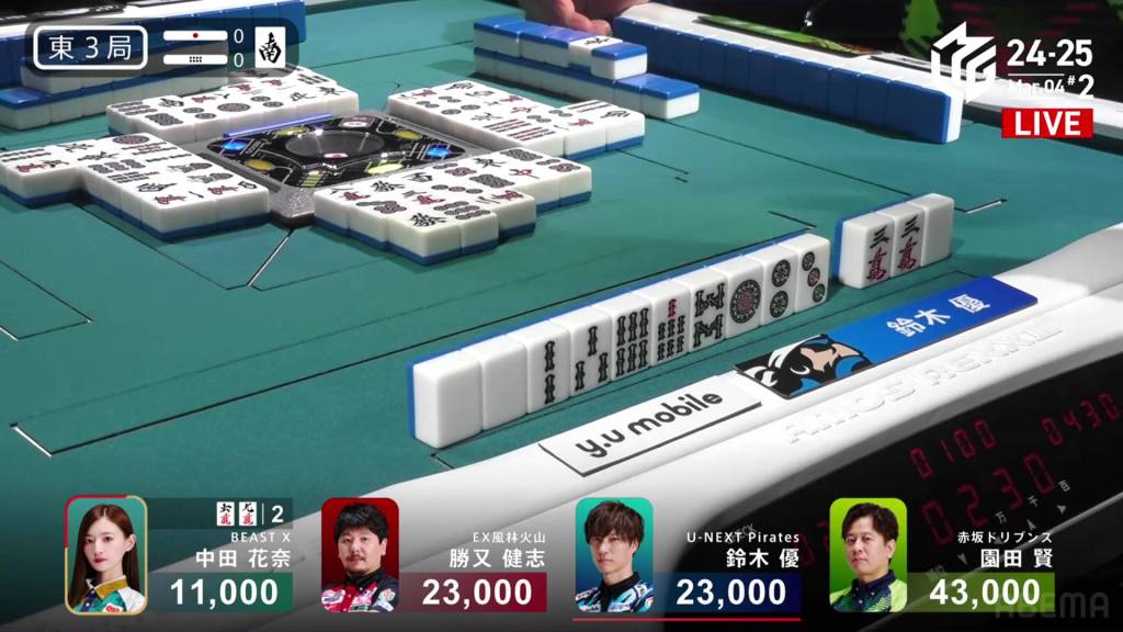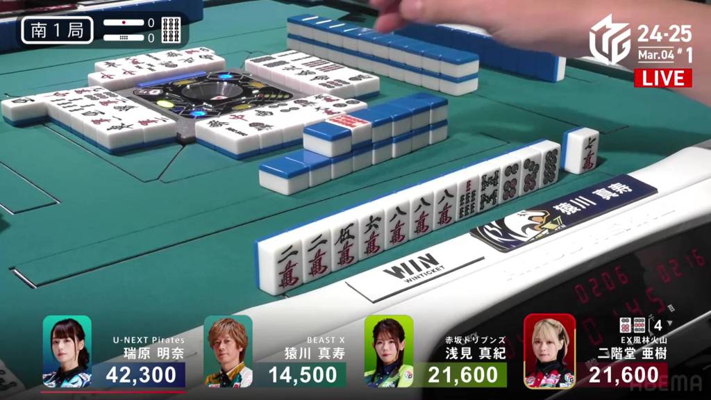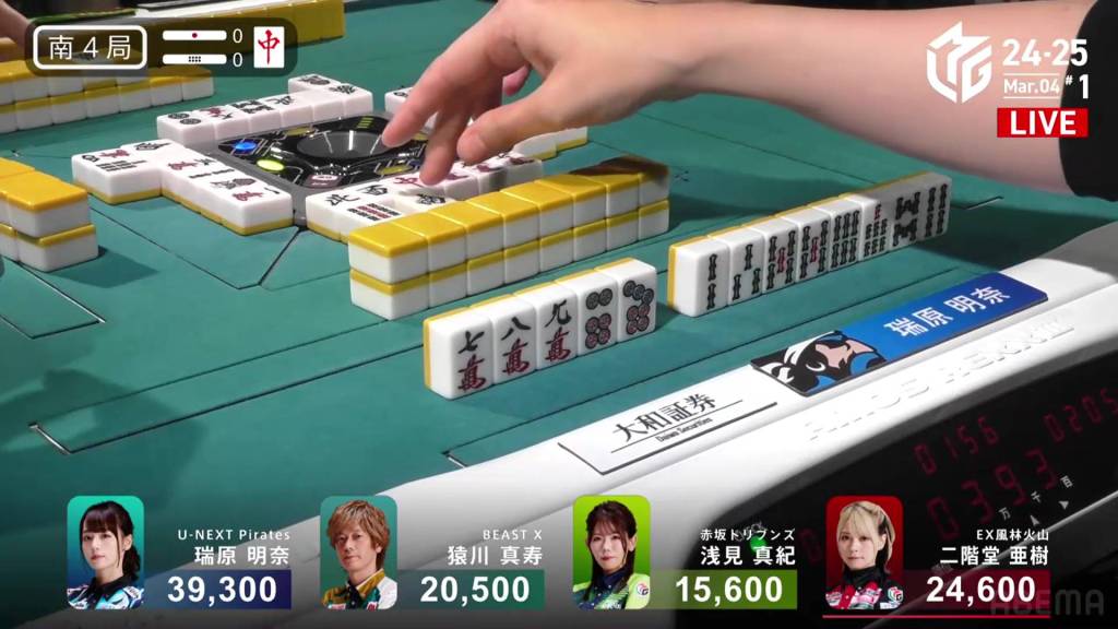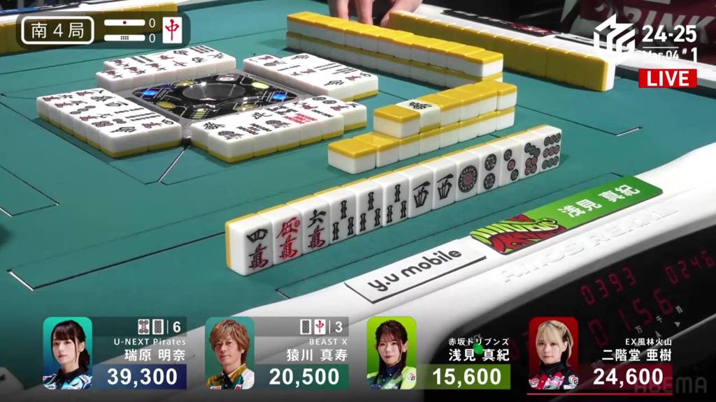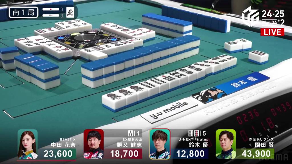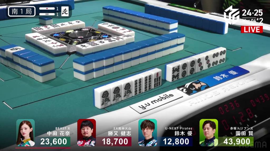 In S1-1, Yu is in 4th place, 5,900 behind 3rd place Katsumata and 10,800 behind 2nd place dealer Nakada. 1,300 in bonuses are up for grabs.