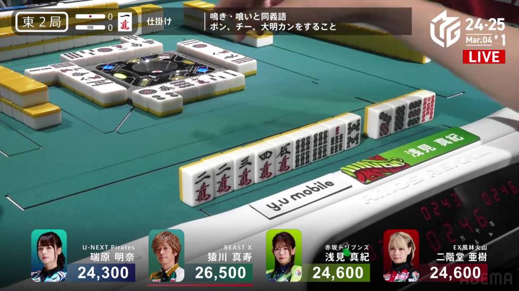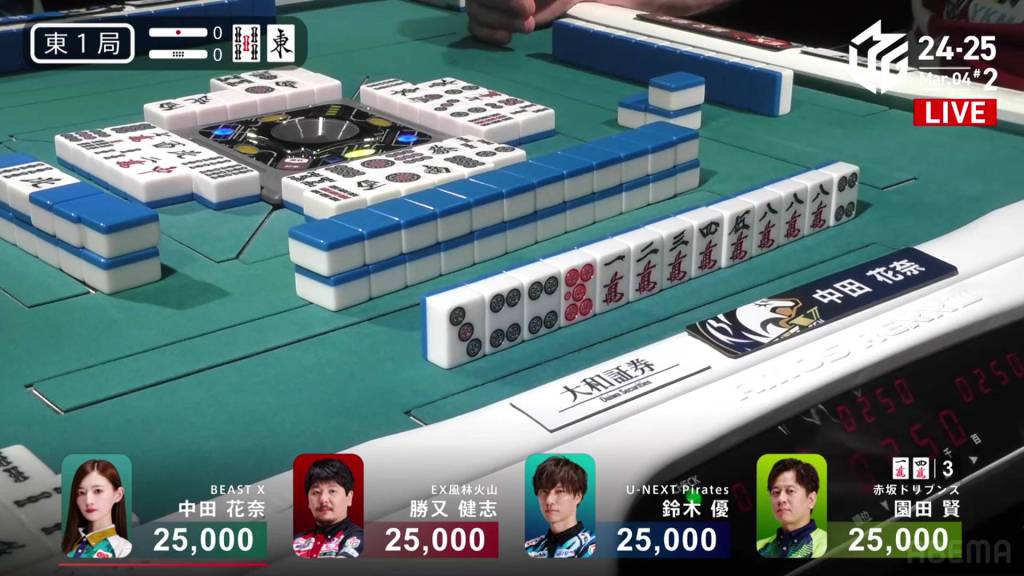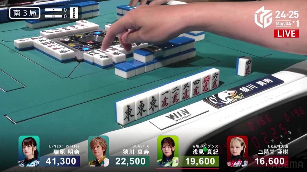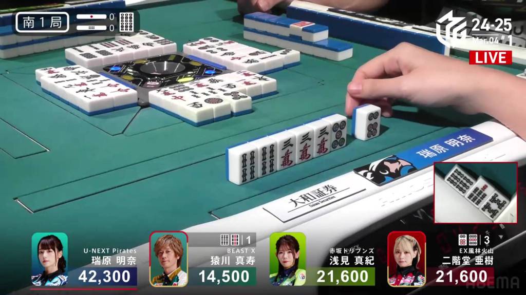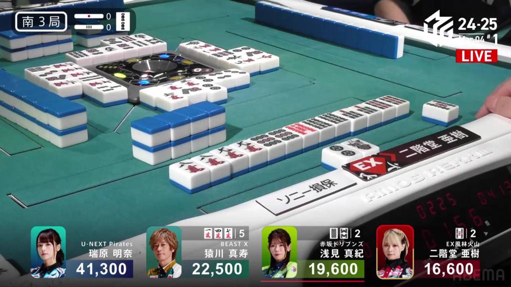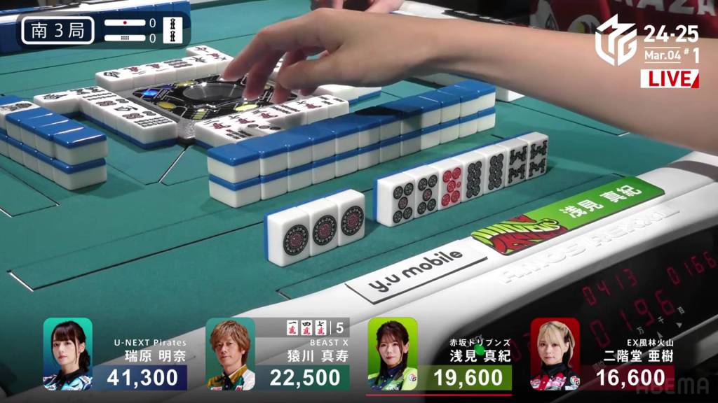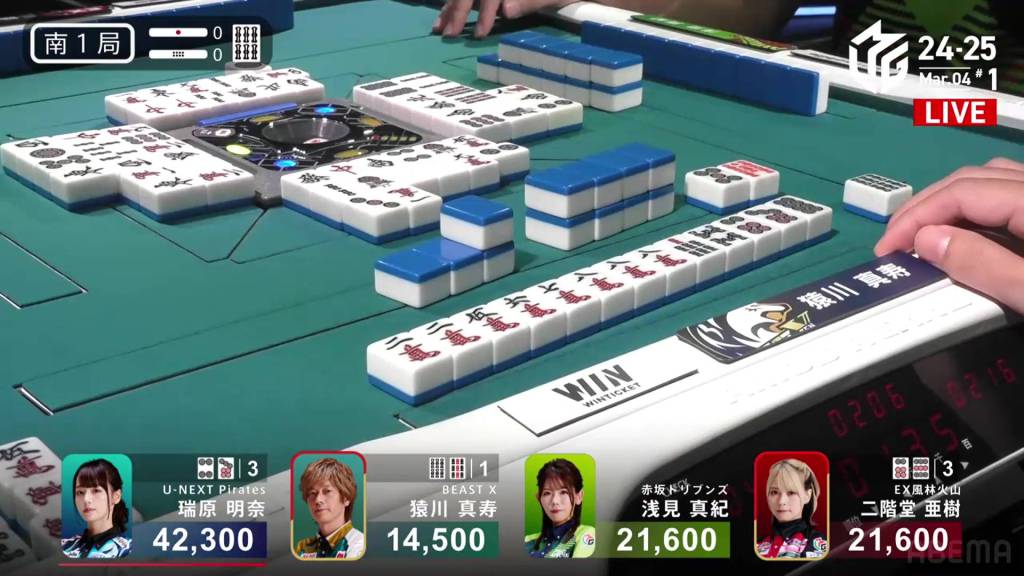 In S1-1, Yu is in 4th place, 5,900 behind 3rd place Katsumata and 10,800 behind 2nd place dealer Nakada. 1,300 in bonuses are up for grabs.