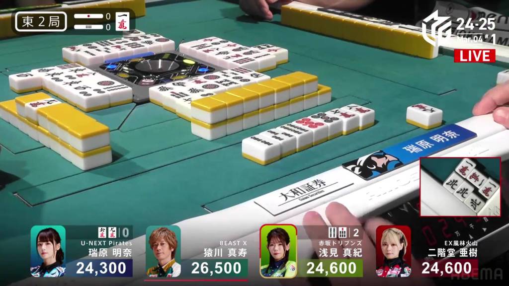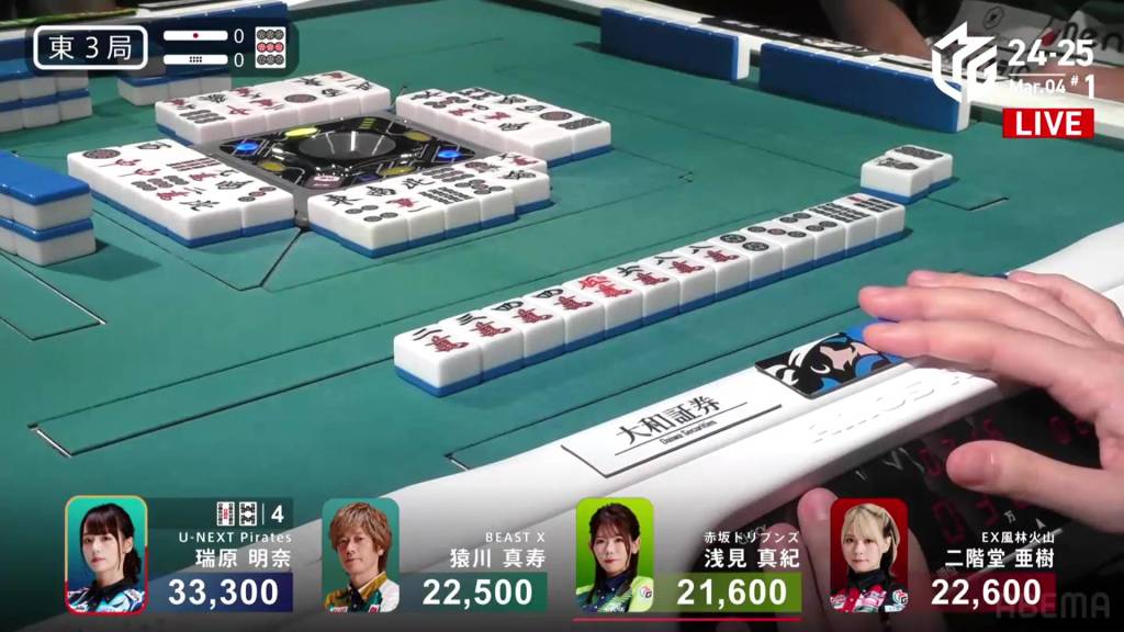 Three players are waiting on the 8p. Though Mizuhara has the advantage in turn order, she ends up folding against Asami’s riichi.