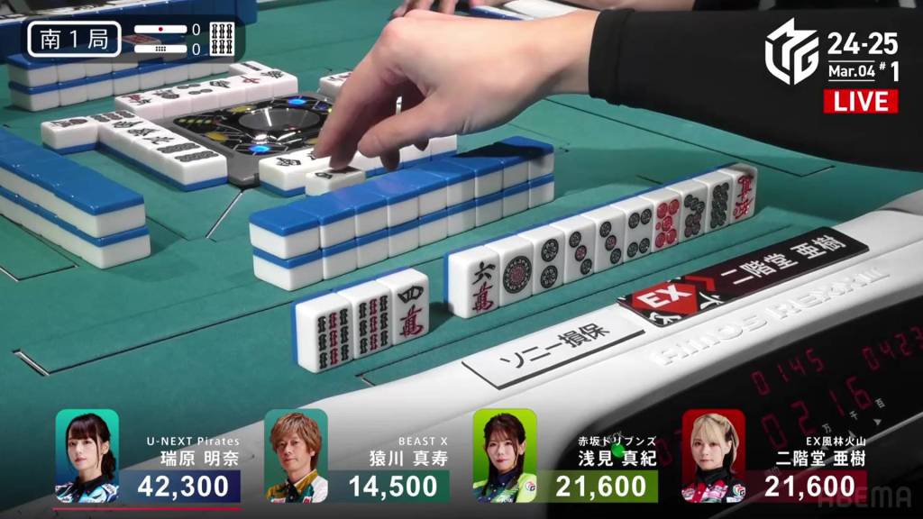 In E1-0, Sonoda is playing for the Akasaka Drivens, trying to recover Asami’s loss the previous game and get the team back above +1000.0pts.