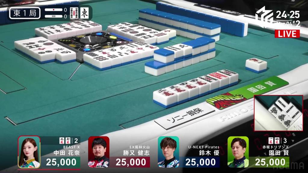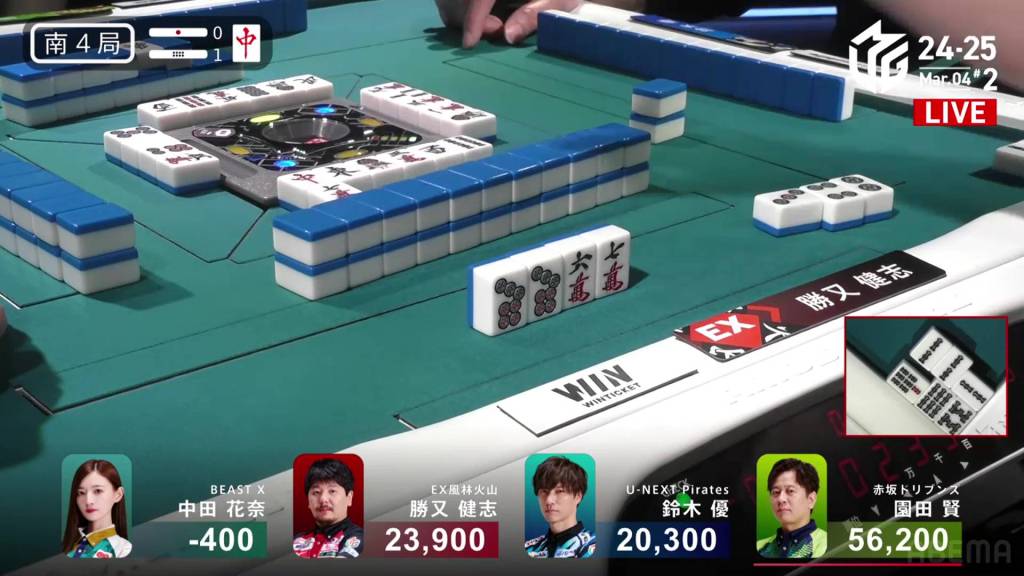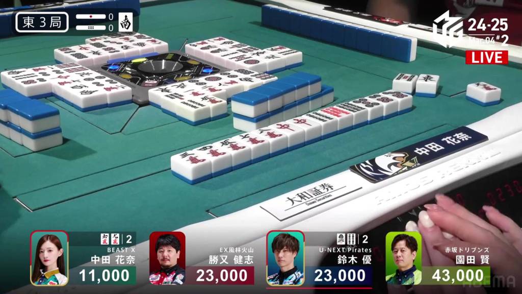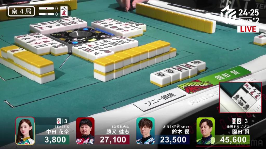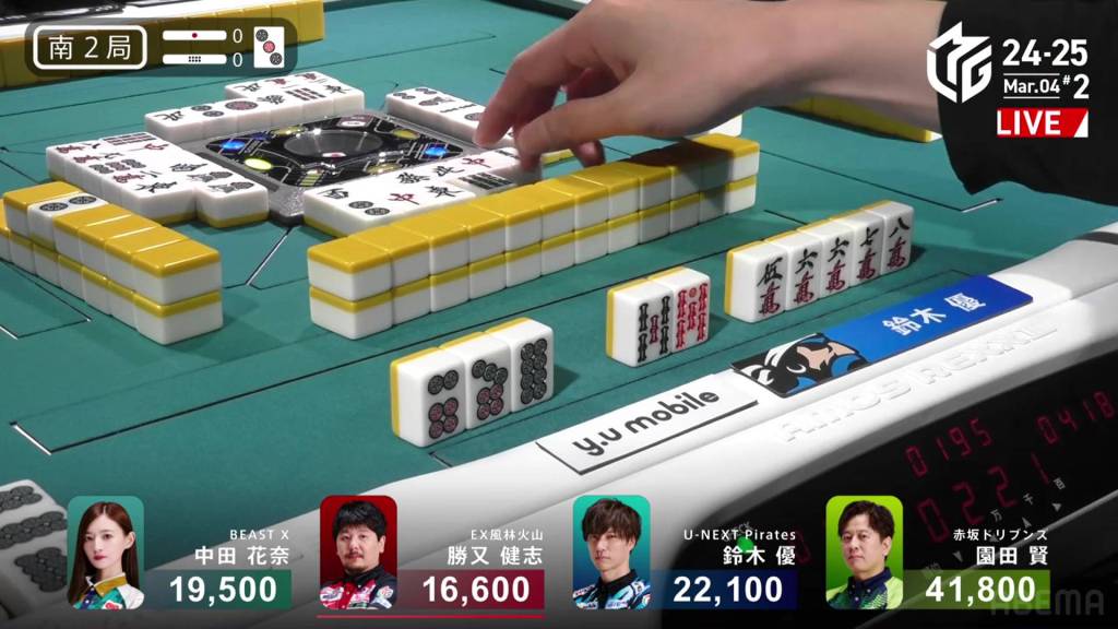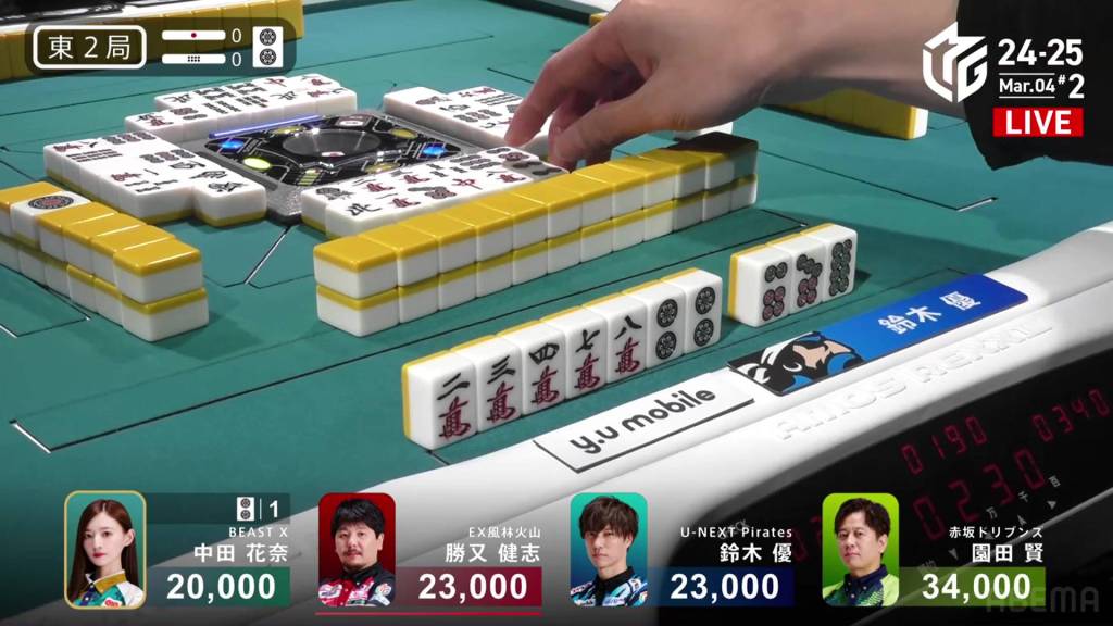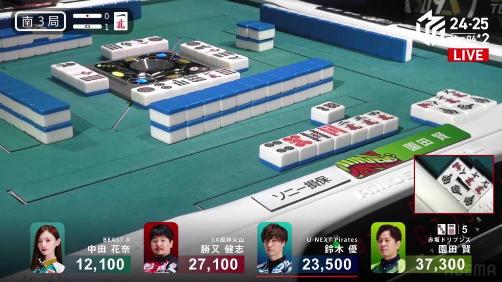 With the kanchan not being ideal, Sonoda looks to improve. As he waits, Katsumata calls a concealed hand of the 9m, but the kandora doesn’t help either of them. Im the middle of the second row, Sonoda calls pon on the 2s and switches to a 14m ryanmen.
