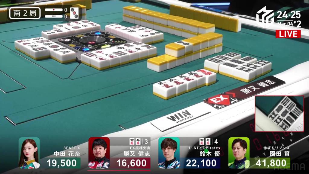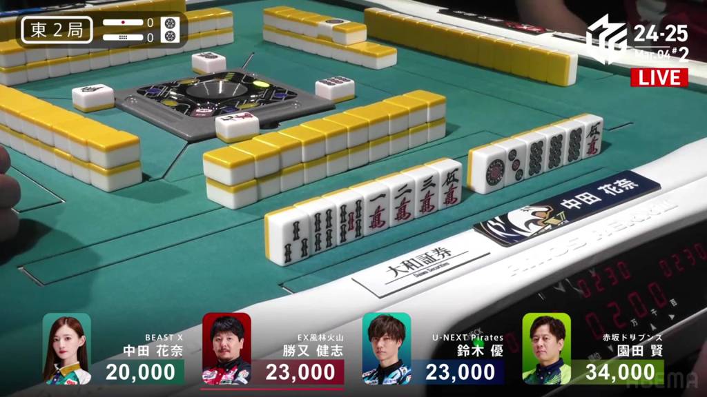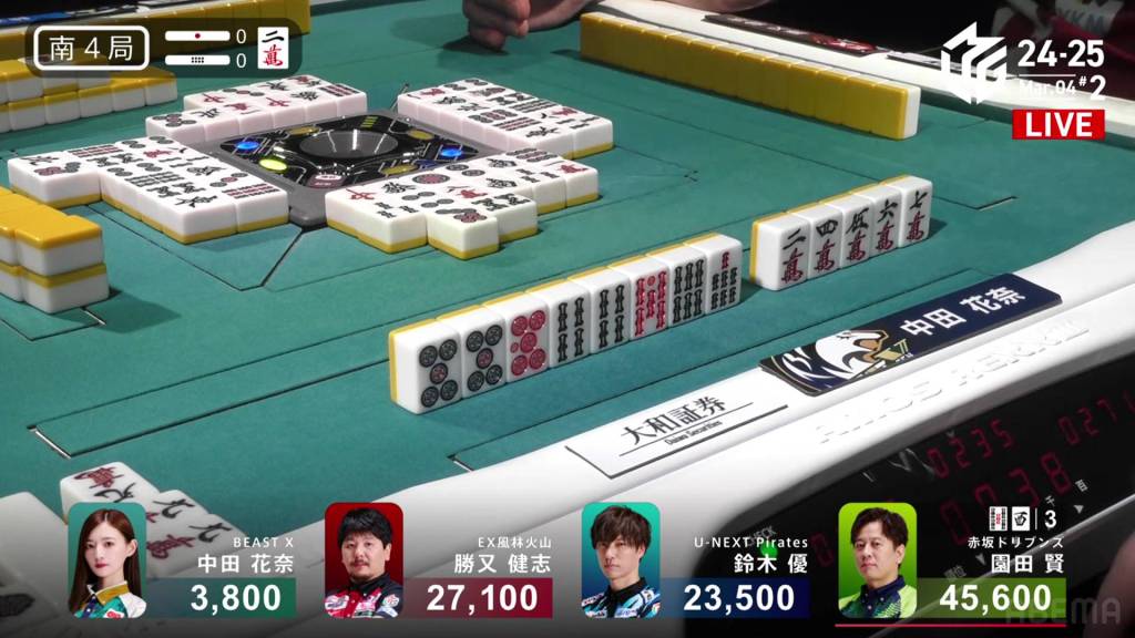 In S2-0, Katusmata is the dealer in 4th place, 2,900 behind 3rd place Nakada and 5,500 behind 2nd place Yu.