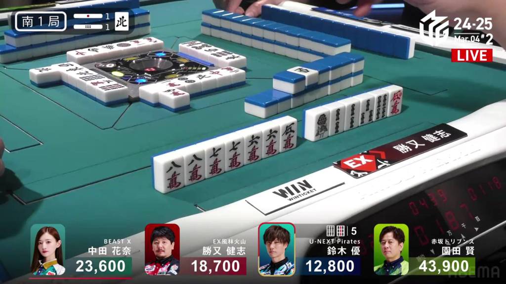 Across from him, Katsumata is trying to make a fast hand and secure his 2nd place. Right after another, Katsumata calls a 678s sequence and a 2s pon, getting to iishanten. With a 234p chii at the start of the second row, Katsumata gets to tenpai and waits on a 58m ryanmen.