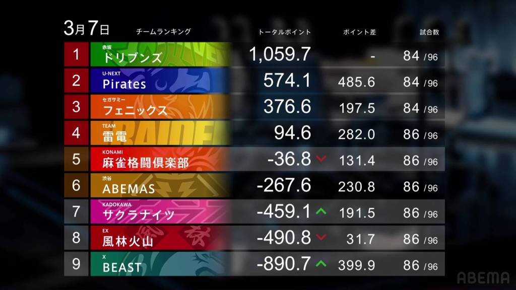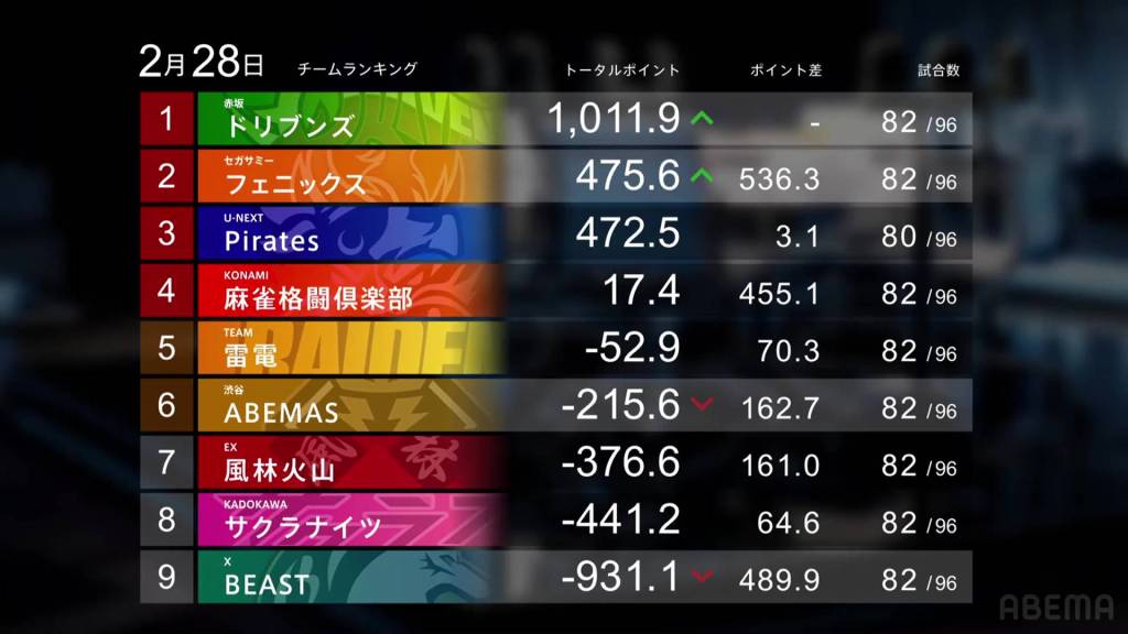 And that’s all for this week! There are three more weeks left in the regular season. The Shibuya Abemas hold a 191.5pts lead over 7th place, but anything can happen in 3 weeks. For the MVP fight, 40.8pts separate 1st and 3rd. Who will take the playoff spots? Who will be the next M-League MVP? As always, we’ll just have to wait and see!