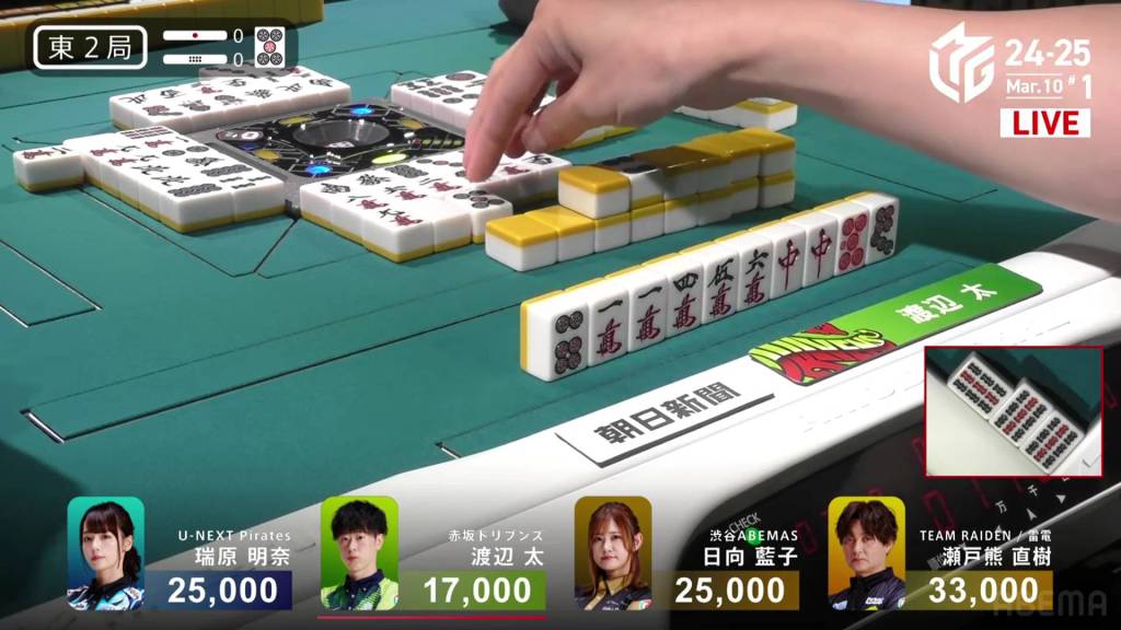 With Taro’s very first draw, he is iishanten and already holds a secured red 5p and a dora 3p. With pairs of 9m, 5p and green dragon, he just has to make two of them into triplets to win the hand.
