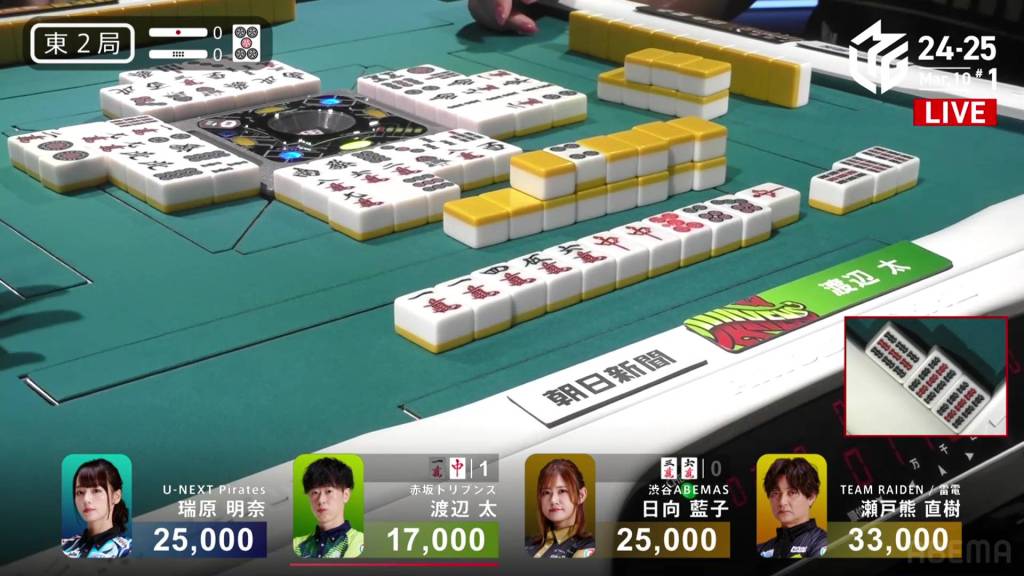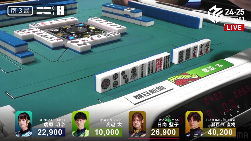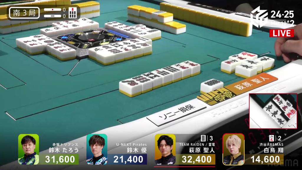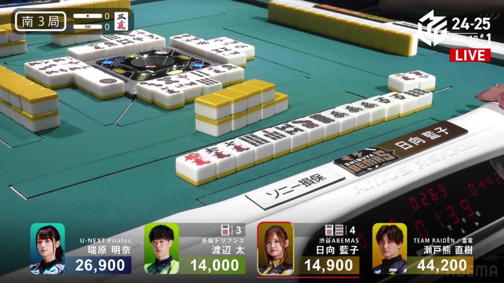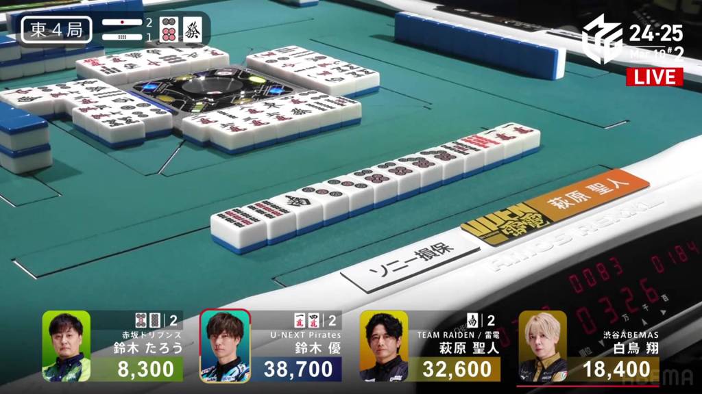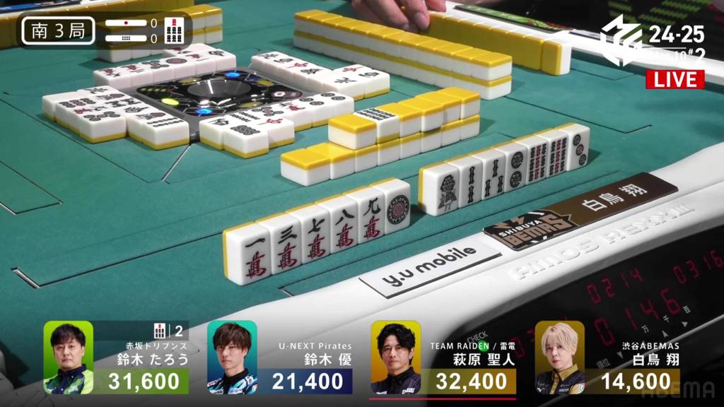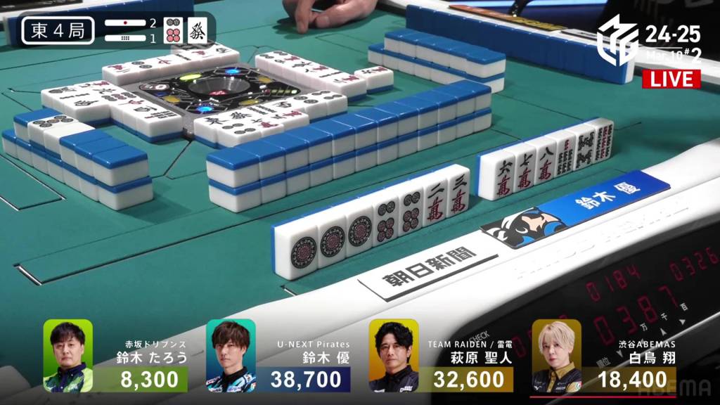 In S4-0, Futoshi now 5,900 behind 3rd place Hinata and 7,400 behind 2nd place Mizuhara. If Futoshi can get a mangan, he will move up to 2nd. With something smaller like a 3/40 or 4/20 tsumo, or a 3-han direct hit off either, he will get at least 3rd.