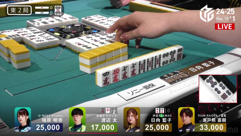 Though three 3s remain in the wall, none of them seem to be coming. In the meantime, Mizuhara pushes a pinzu honitsu. Through the second row, she also adds toitoi to the hand and eventually gets to a 6p/8p shanpon, guaranteed a haneman if she wins.