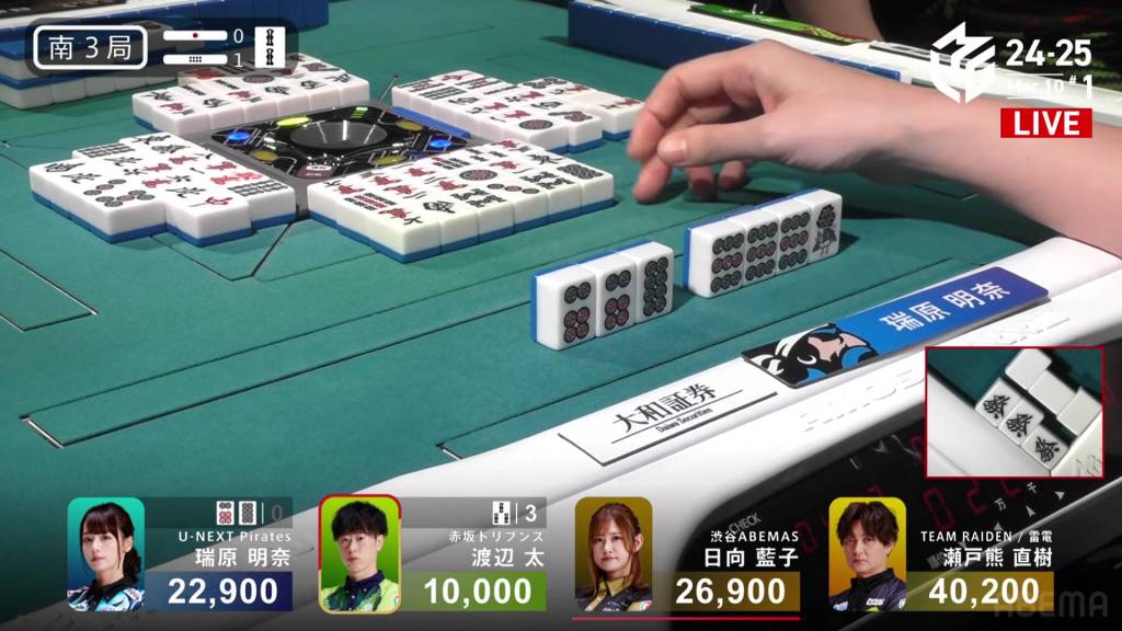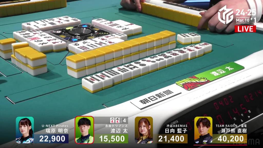 In S3-1, Futoshi is in 4th place, 12,900 behind 3rd place Mizuhara and 16,900 behind 2nd place dealer Hinata. With no dealership left, Futoshi effectively only has two hands left to overcome the gap.