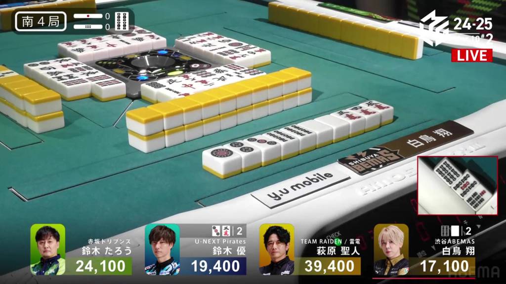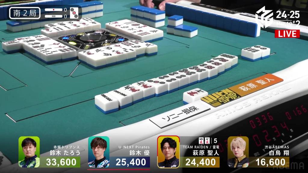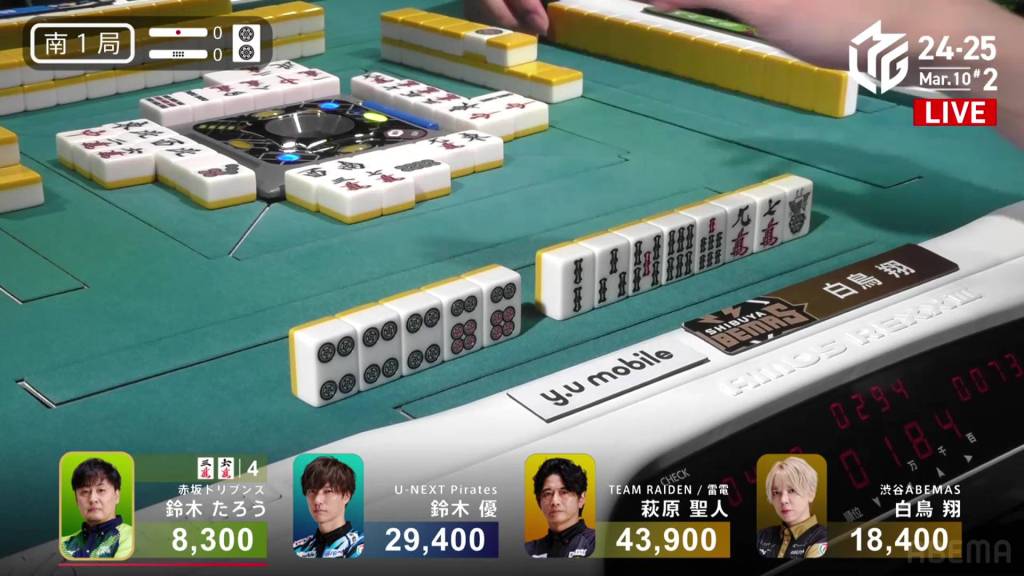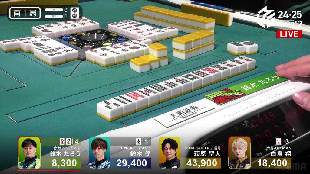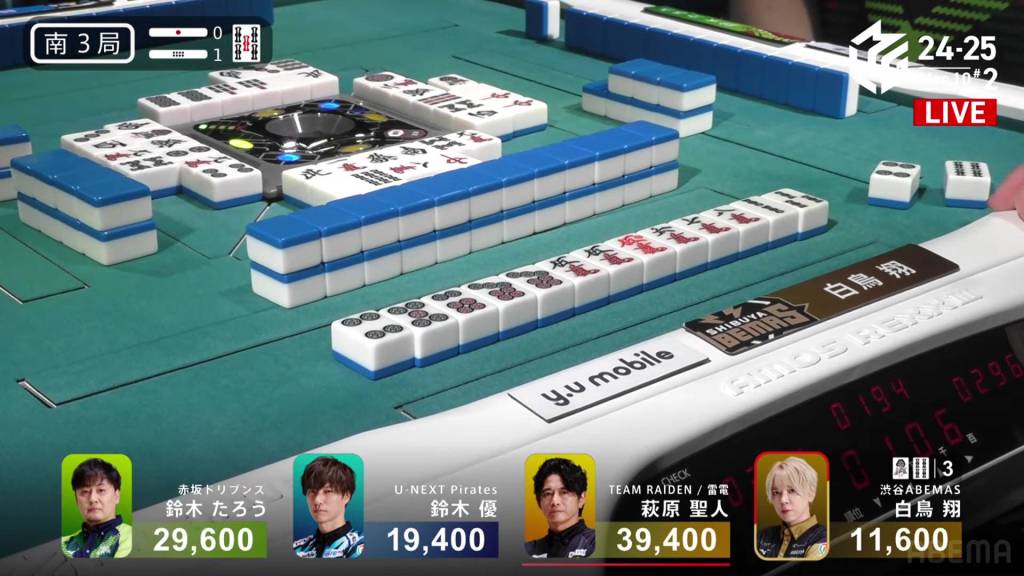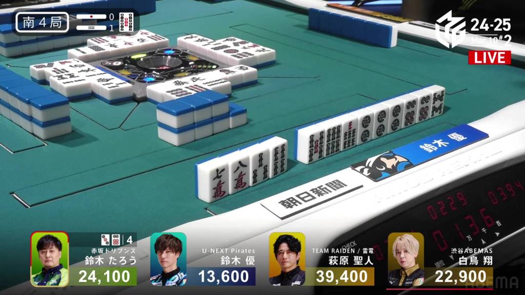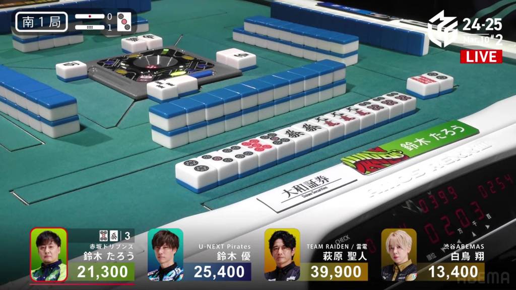 In S1-0, Taro is the dealer in 4th place, 10,100 behind 3rd place Shiratori. If Taro wants to make a comeback, now is his time.