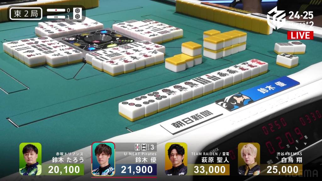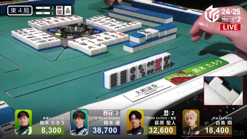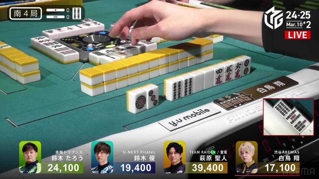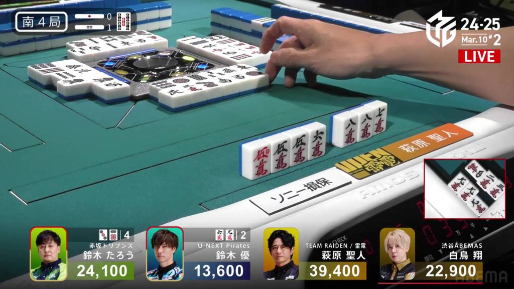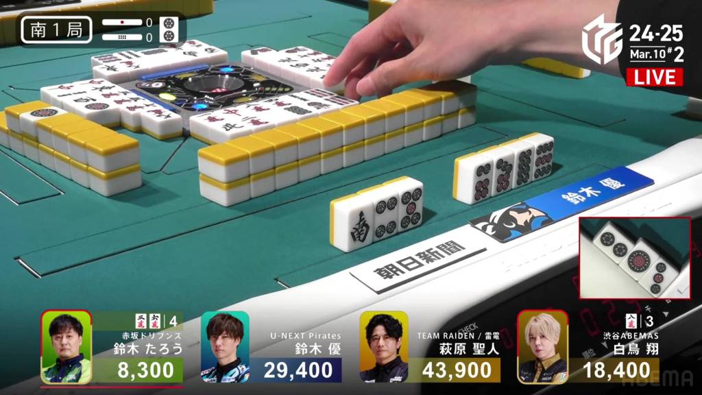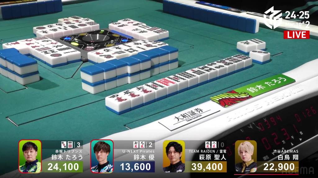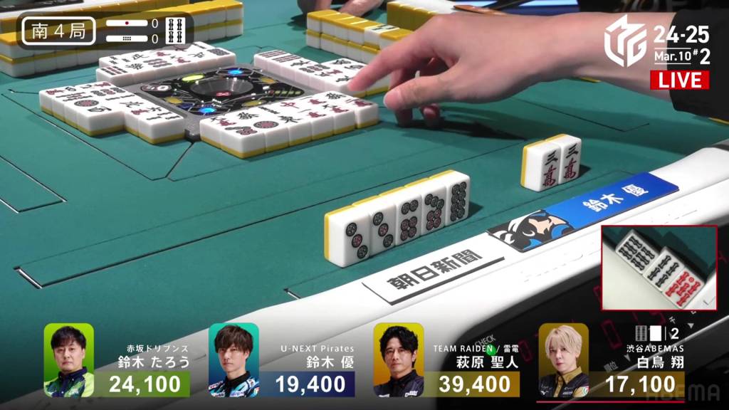 In S1-0, Taro is the dealer in 4th place, 10,100 behind 3rd place Shiratori. If Taro wants to make a comeback, now is his time.