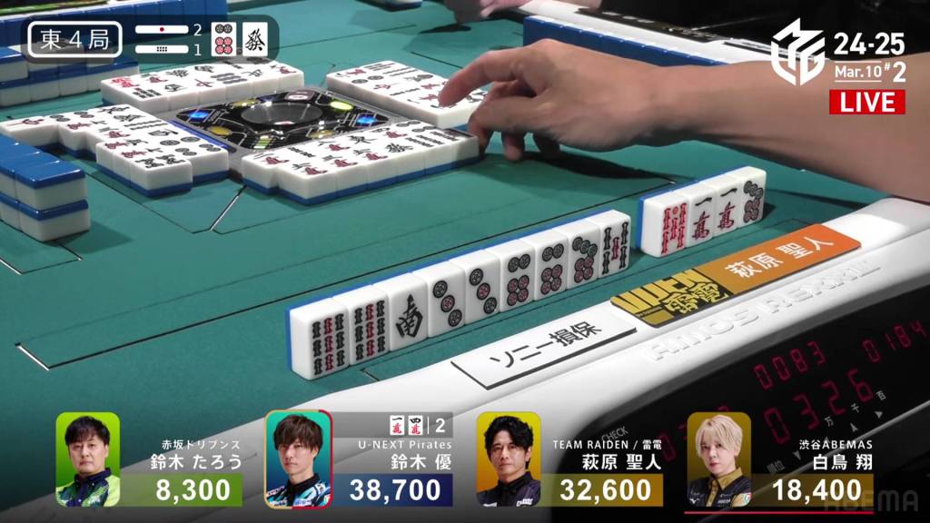 Immediately after, Futoshi discards the white dragon trying to keep his iishanten and deals into Setokuma. Setokuma wins the hand with Riichi/Ippatsu/White Dragon/Aka 1 for 8,000.