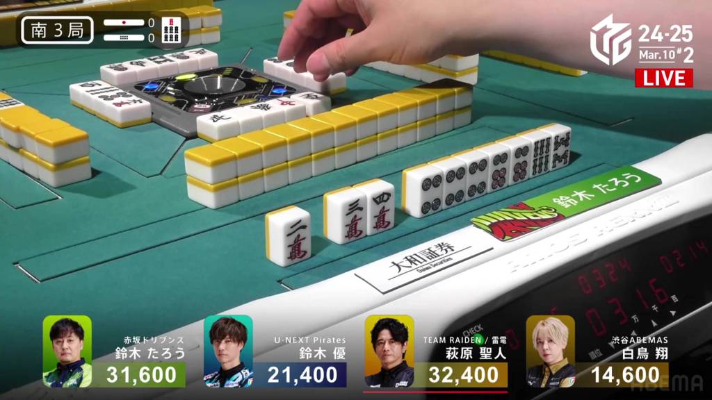 In S2-0, Hagiwara is in 3rd place, 1,000 behind 2nd place dealer Yu and 9,200 behind 1st place Taro.