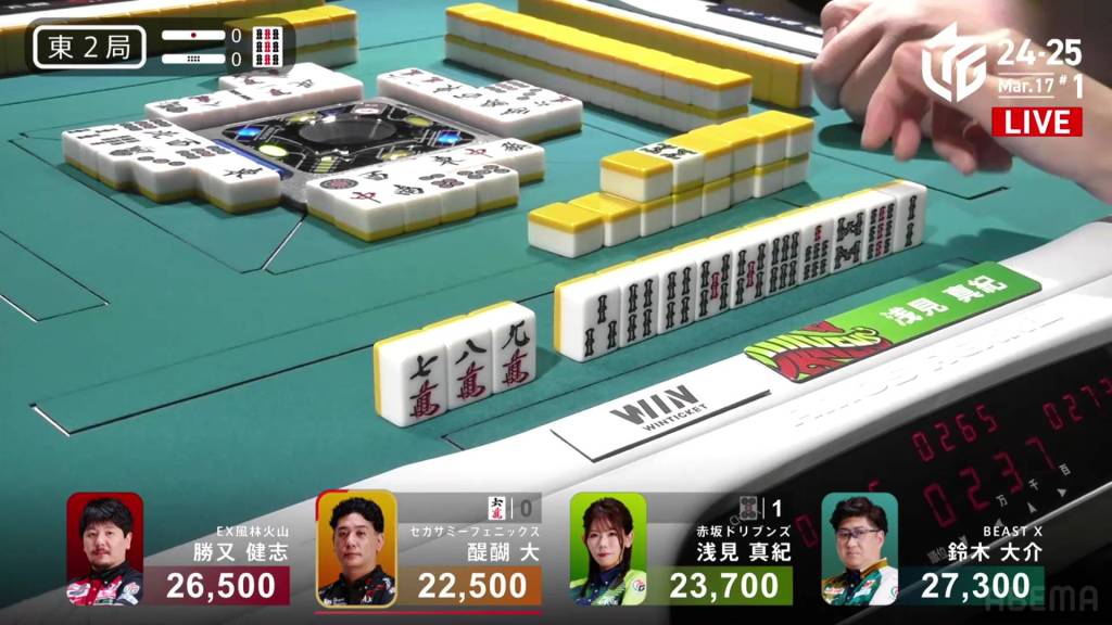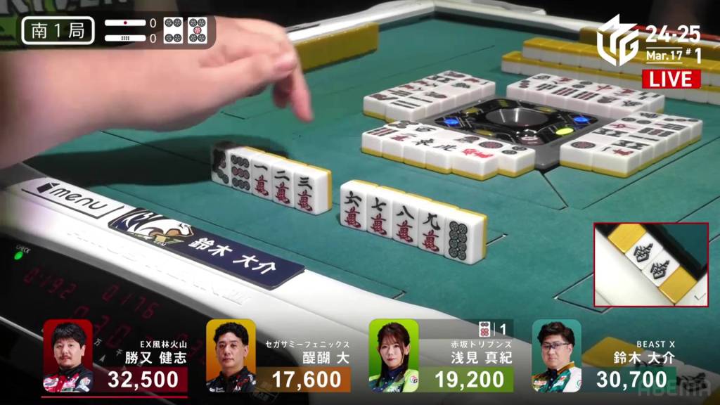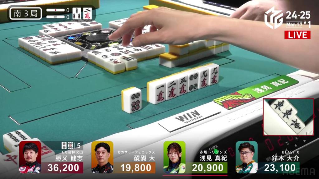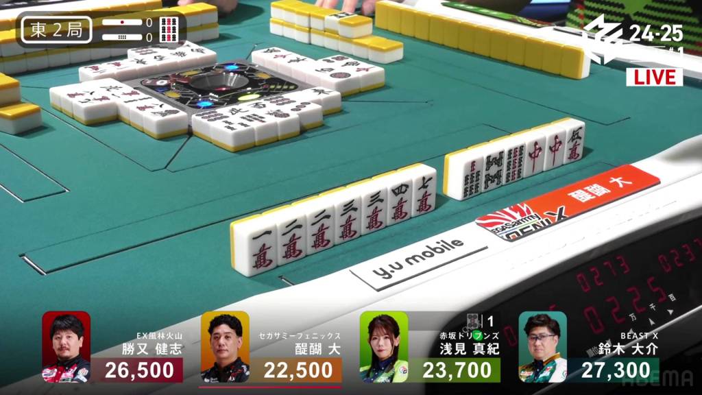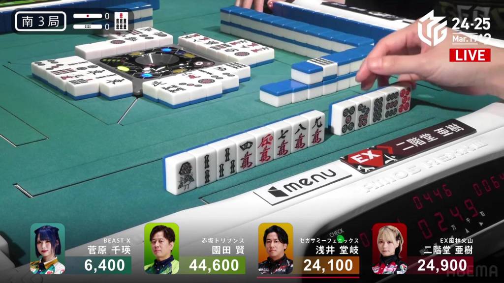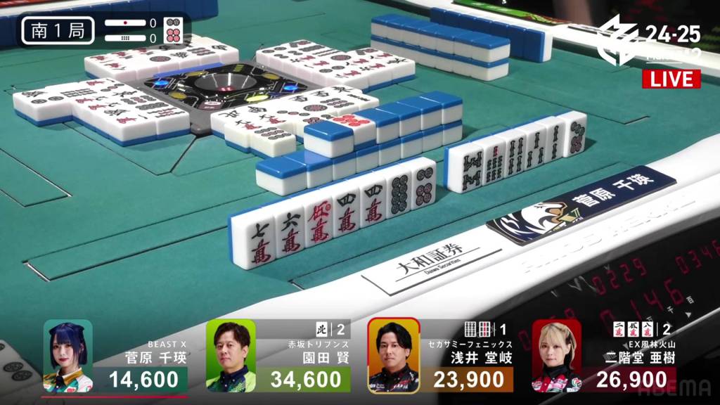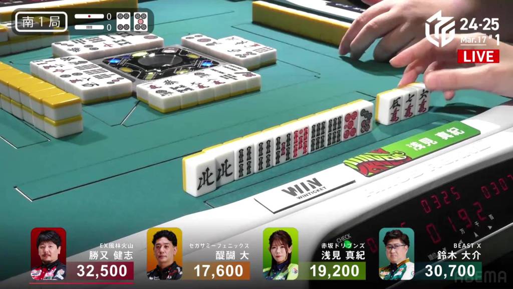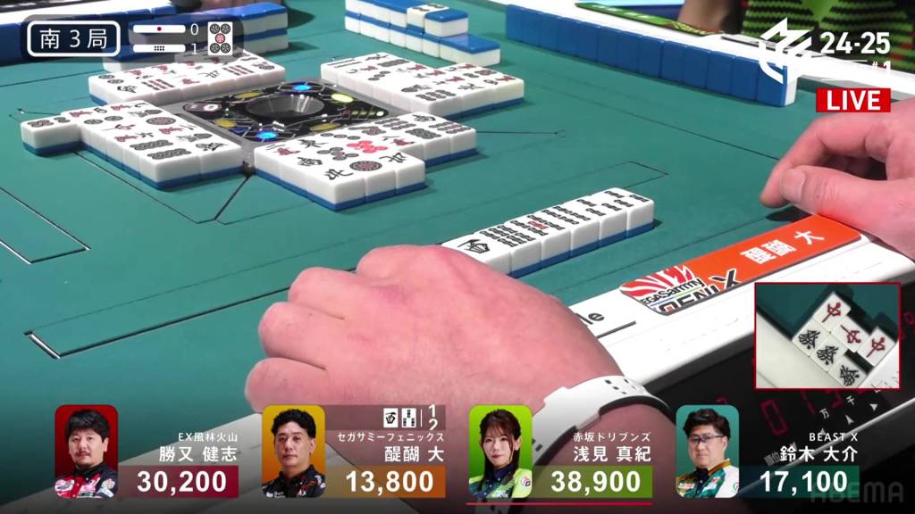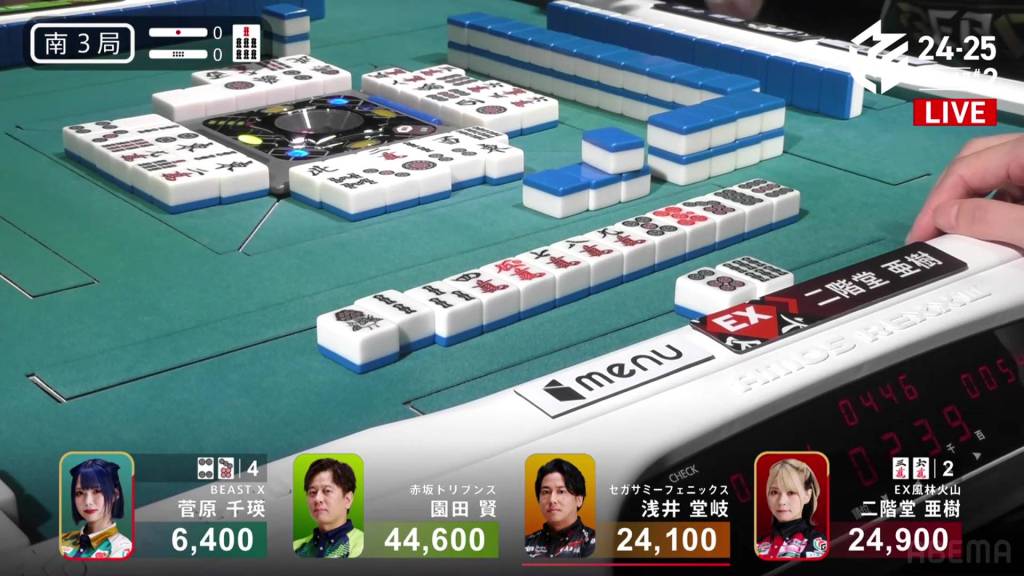 Ok Asami’s draw, she improves the wait and calls riichi on a 25s nobetan.