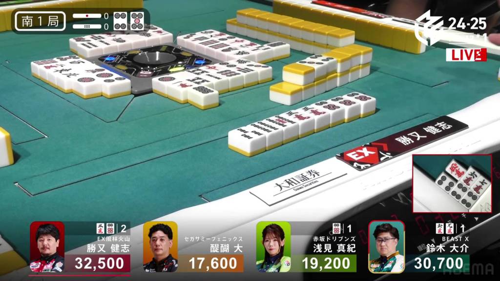 Despite these two with their open efforts, Katsumata is the first to tenpai, who has been quietly building his hand and waits dama on a 25p ryanmen.