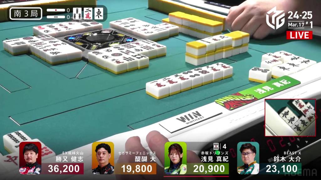 On Asami’s turn, she draws a fourth east and calls kan. With the kandora flip, the easts suddenly become the new dora and her hand is upgraded to a haneman!