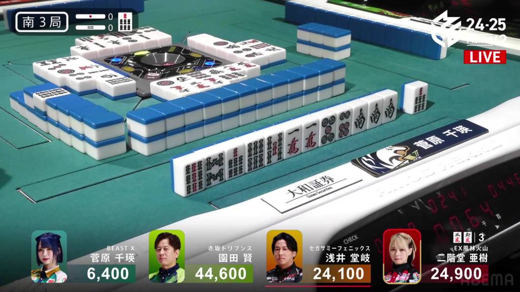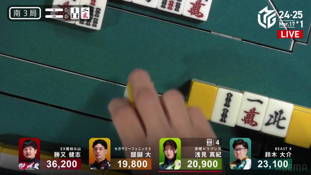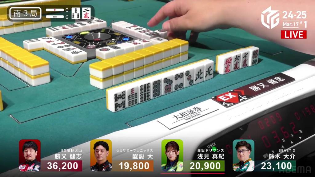 In S3-0, Asami is the dealer in 3rd place 2,200 behind 2nd place Daisuke and 15,300 behind 1st place Katsumata.