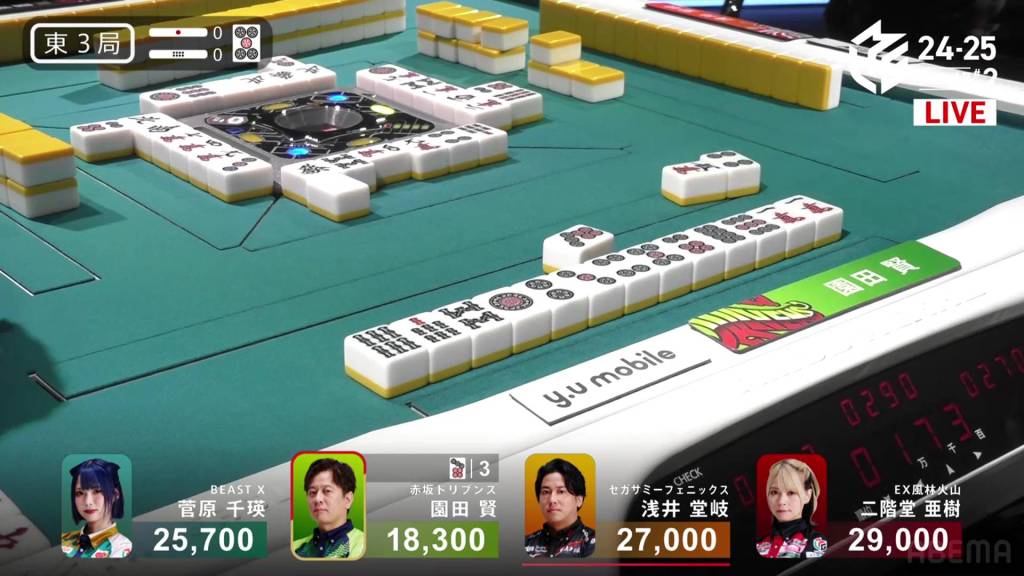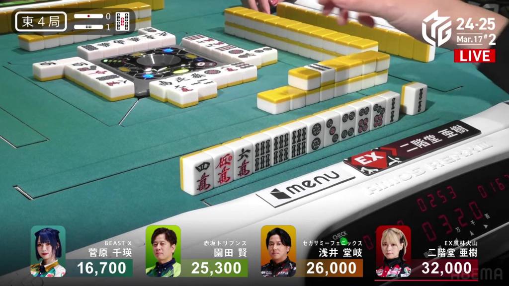 Then, on Sugawara’s ippatsu turn, she draws and discards the 3m and deals into Aki. Aki wins the hand with Riichi/Pinfu/Aka 2/Ura 1 for 8,000 plus a riichi stick, increasing Aki’s grip on 2nd place and pushing Sugawara into the negatives.