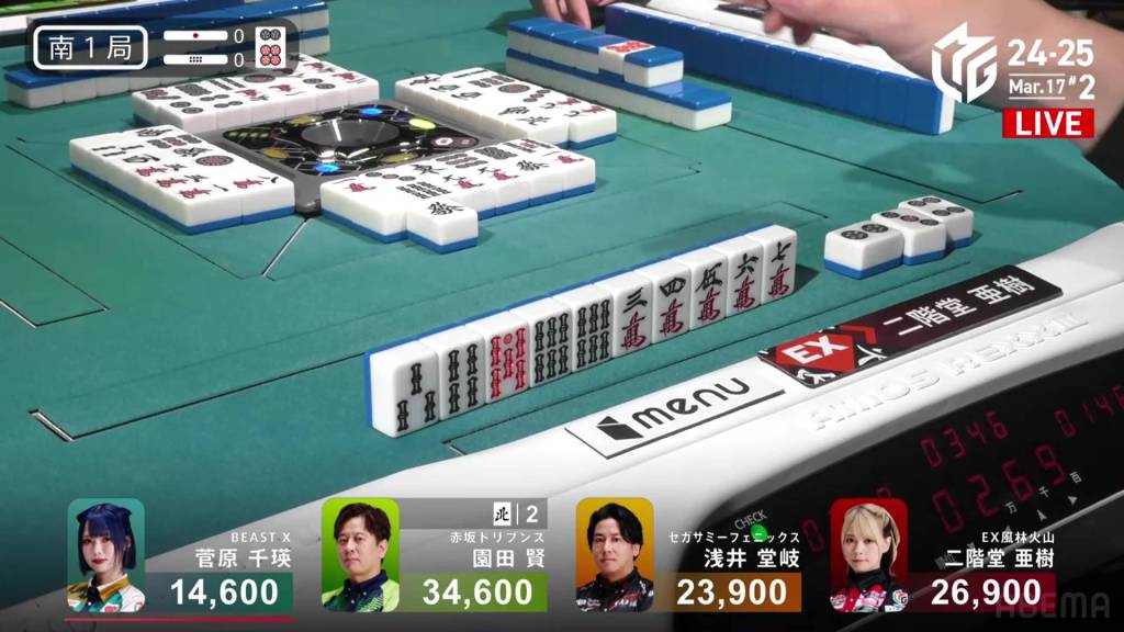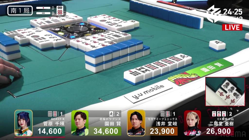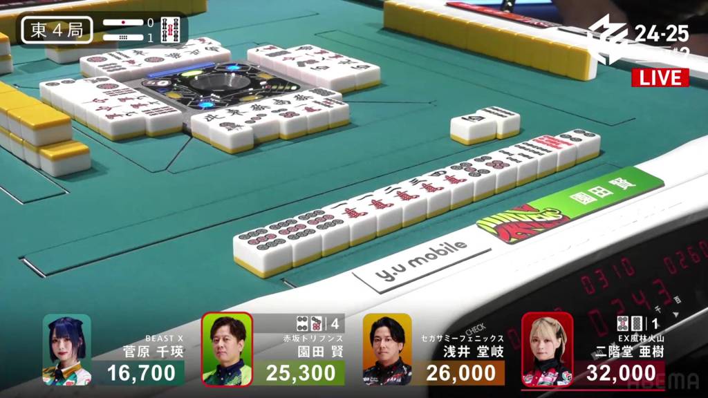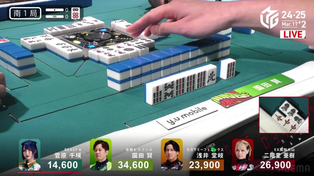 However, all these riichi and tenpai calls are all for naught as Sonoda draws the north right after and wins the hand. Sonoda wins with Honitsu/Chanta/Red Dragon for 2,000/4,000 plus two riichi sticks, taking Sonoda to 44,600.