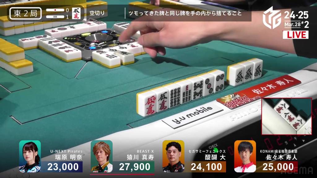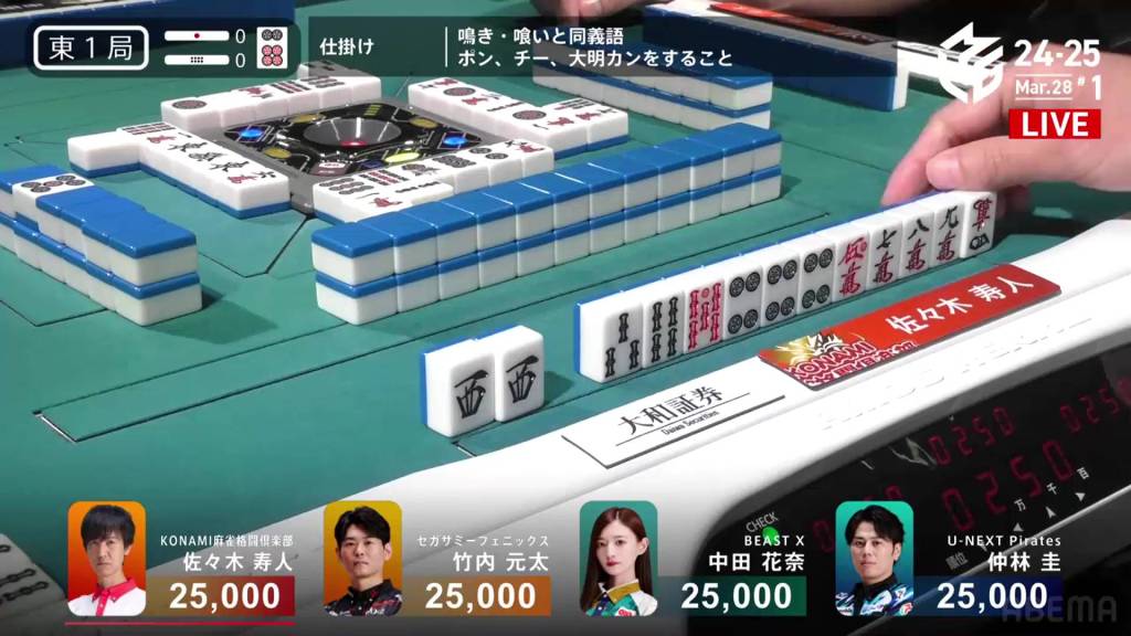 Immediately after, Nakabayashi draws and discards the green dragon, a tile that would have been Nakada’s winning tile.