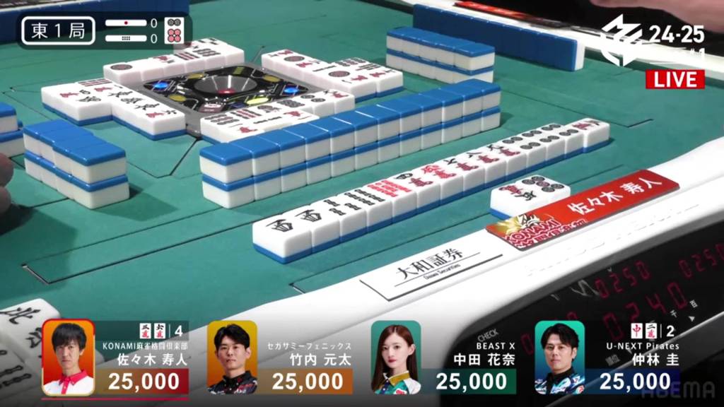 In E4-1, Hisato is the dealer and has a 10,400 lead over 2nd place Mizuhara. Hisato wants to earn as many points as possible to make his 1st place more secure. 1,300 in bonuses will go to the next winner.