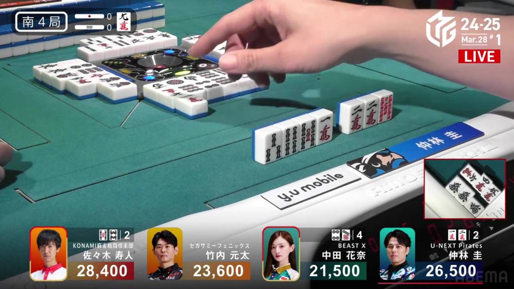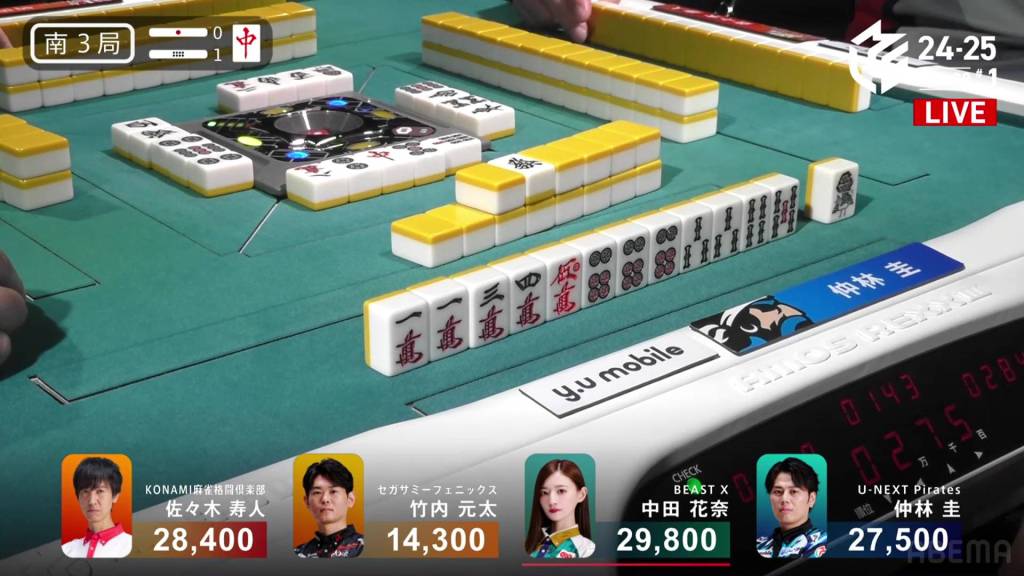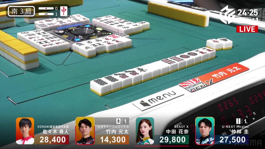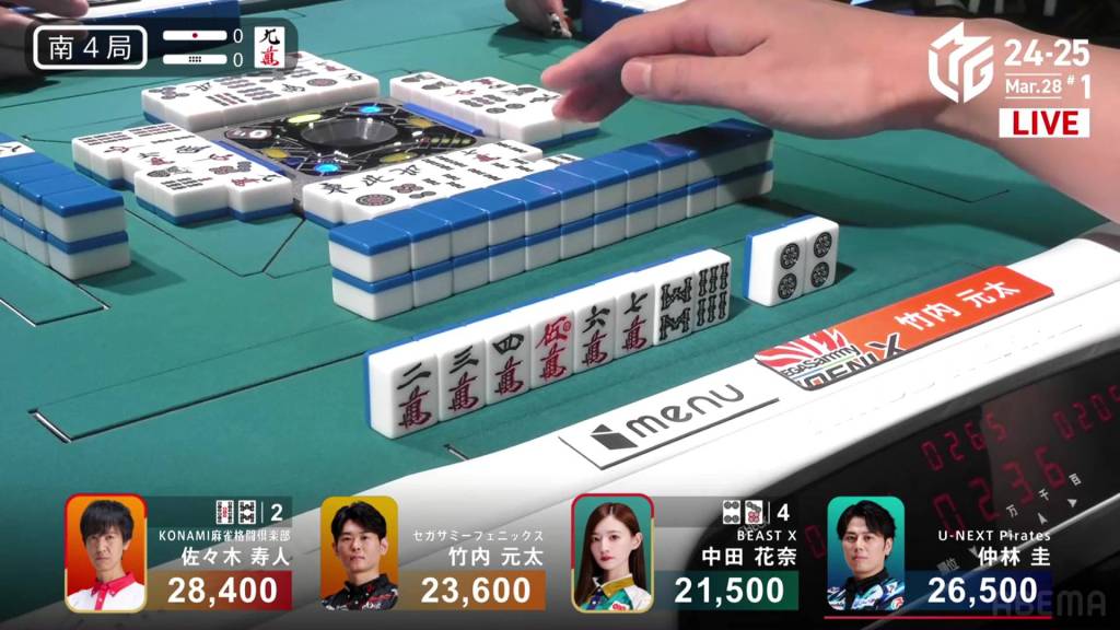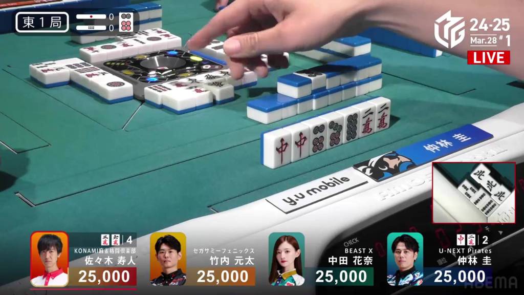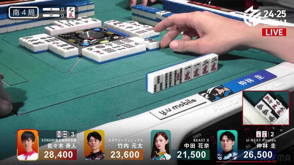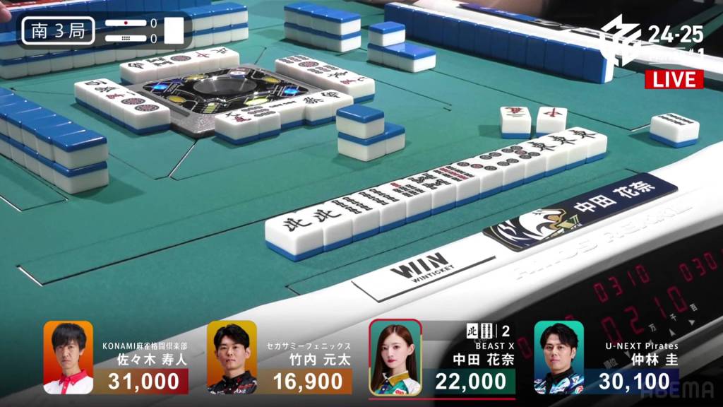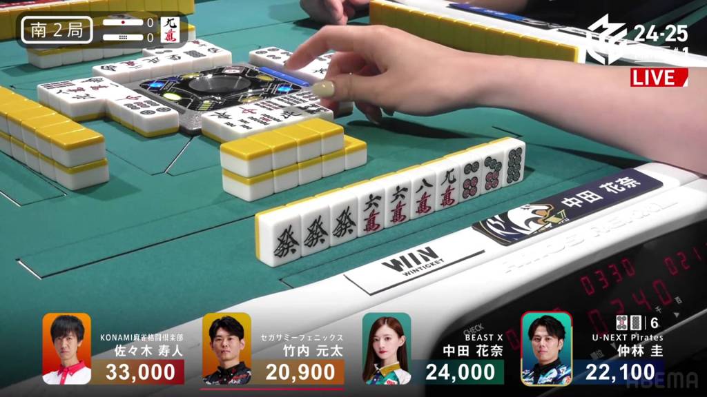 To his left, Nakada has been picking up sequence and is the first to tenpai, waiting on a 3m tanki. In the middle of the second row, she switches to a green dragon tanki.