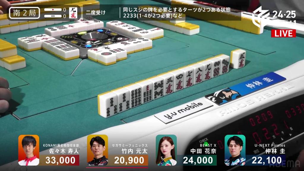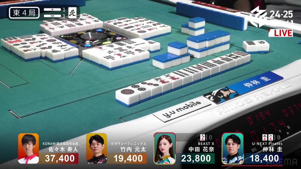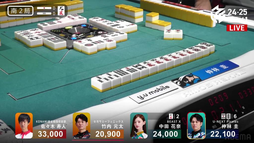 In the third row, Nakada’s final 9m gets drawn by Hisato, leaving her no chance to win. To make things worse, Nakada ends up drawing and discarding the 8m and deals into Nakabayashi. Nakabayashi wins the hand with Riichi/Pinfu for 2,900+300 plus two riichi sticks, moving up from 4th to 2nd place.