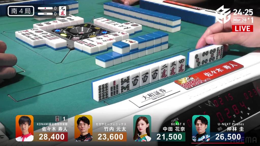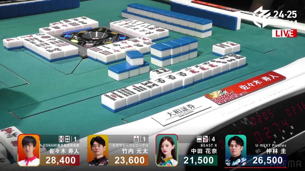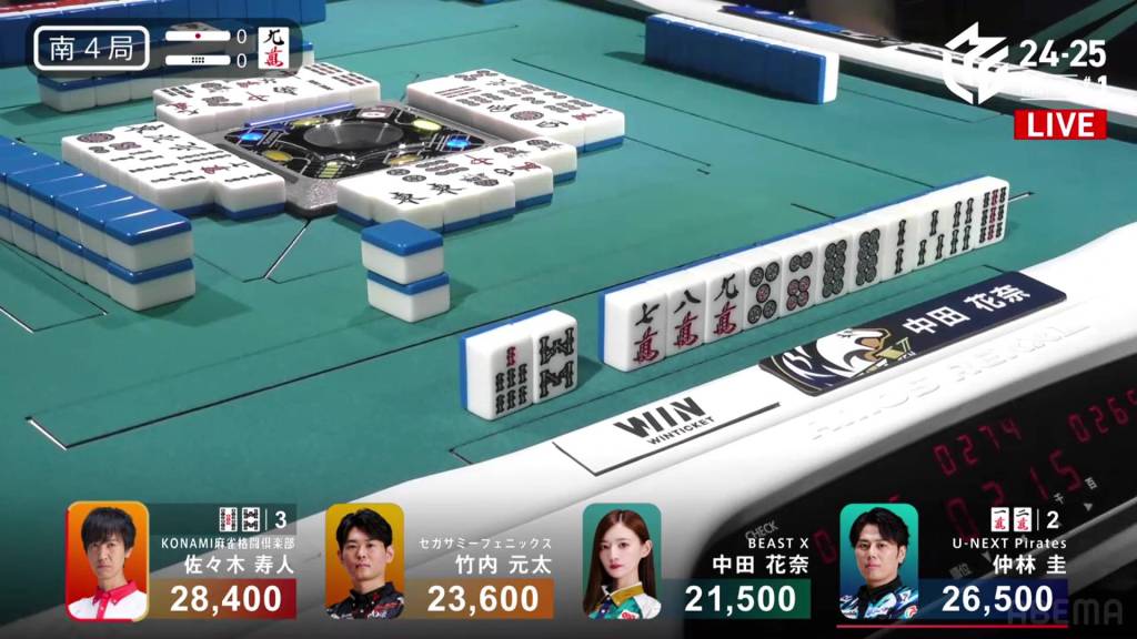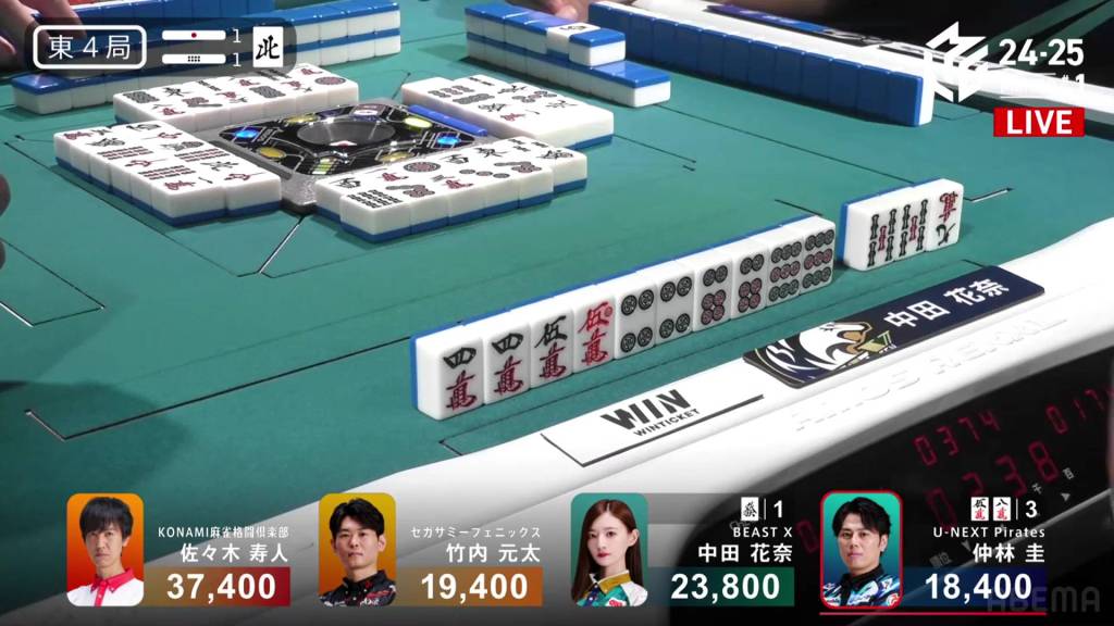 At the end of the row, Nakada draws the 4s and wins the hand. Nakada wins with Riichi/Tsumo/East for 2,600 all, moving into 1st place by 1,400.