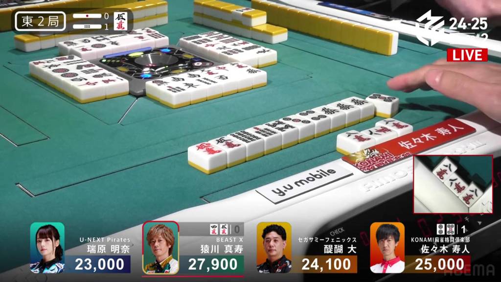 During the ipaptsu round, Mizuhara gets to tenpai and calls riichi on a 2m kanchan. If he can get one more han, she will move up to 3rd place.