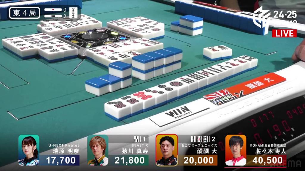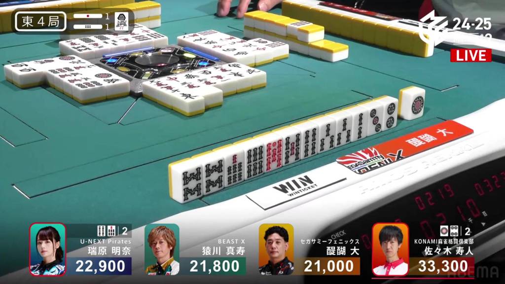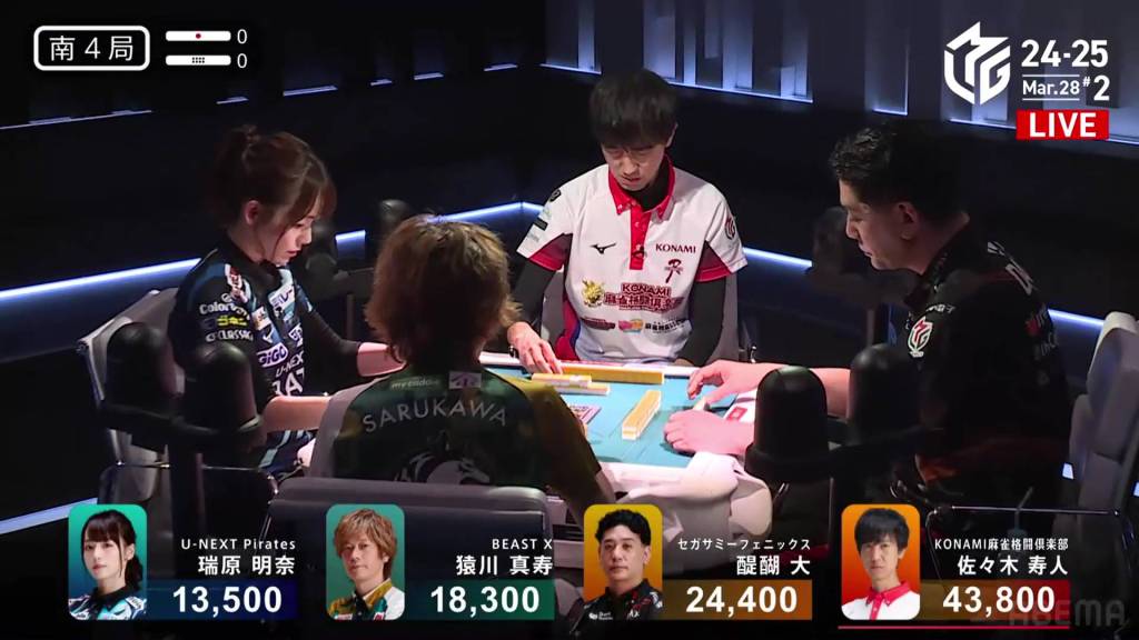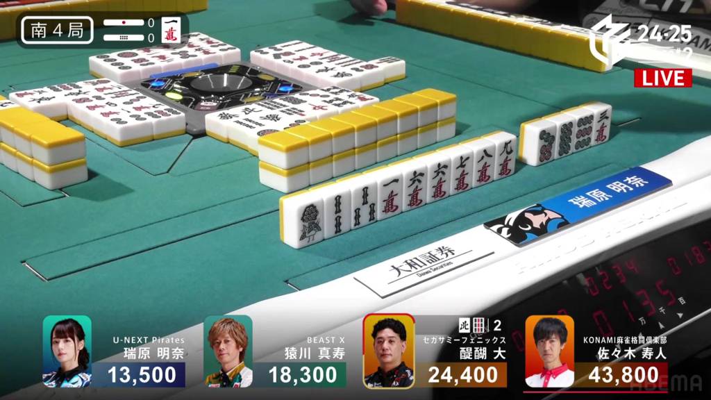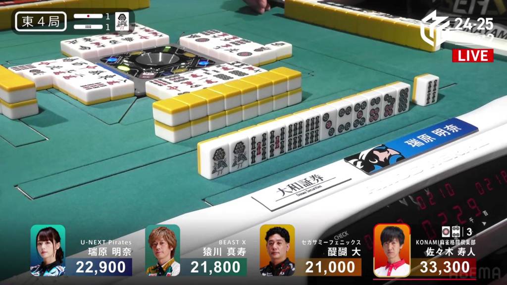 In 2nd place, Daigo is 19,400 behind 1st place Hisato. If Daigo gets a haneman direct hit, a baiman tsumo, or a sanbaiman win, he will finish the game in 1st place and become the next M-League MVP.