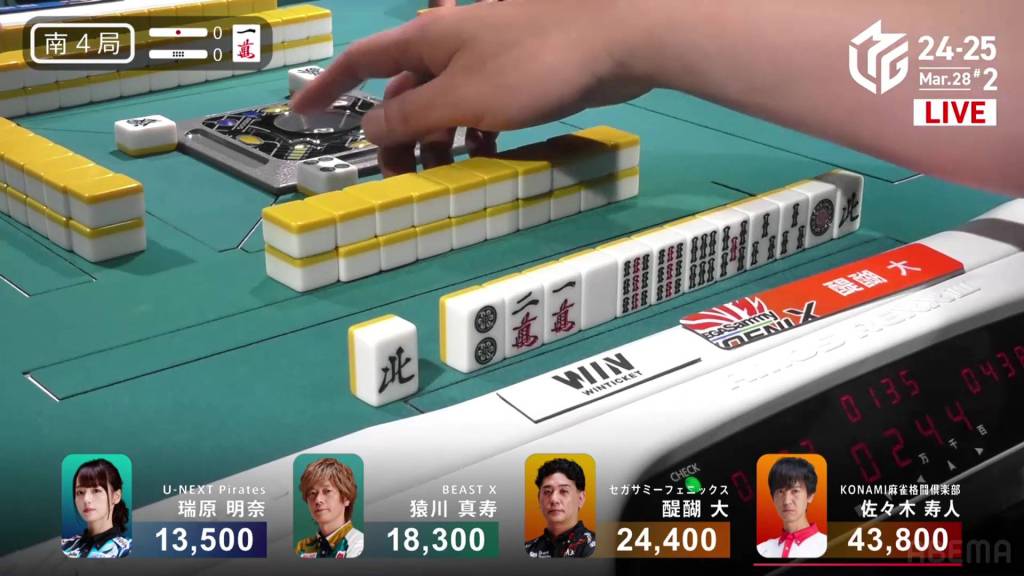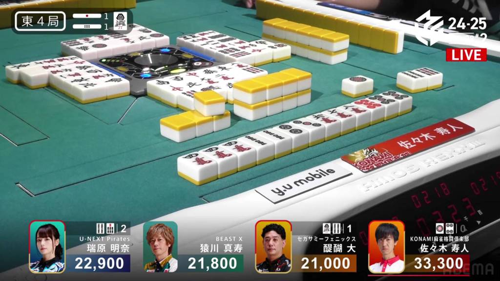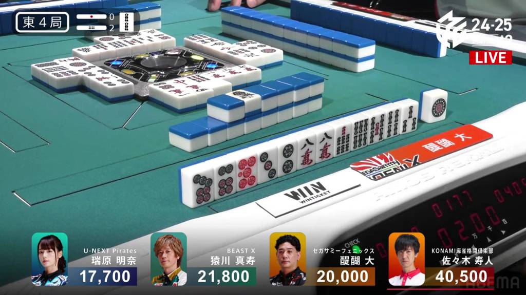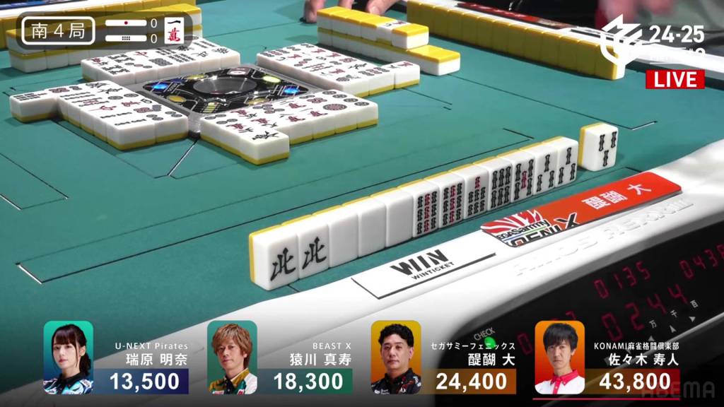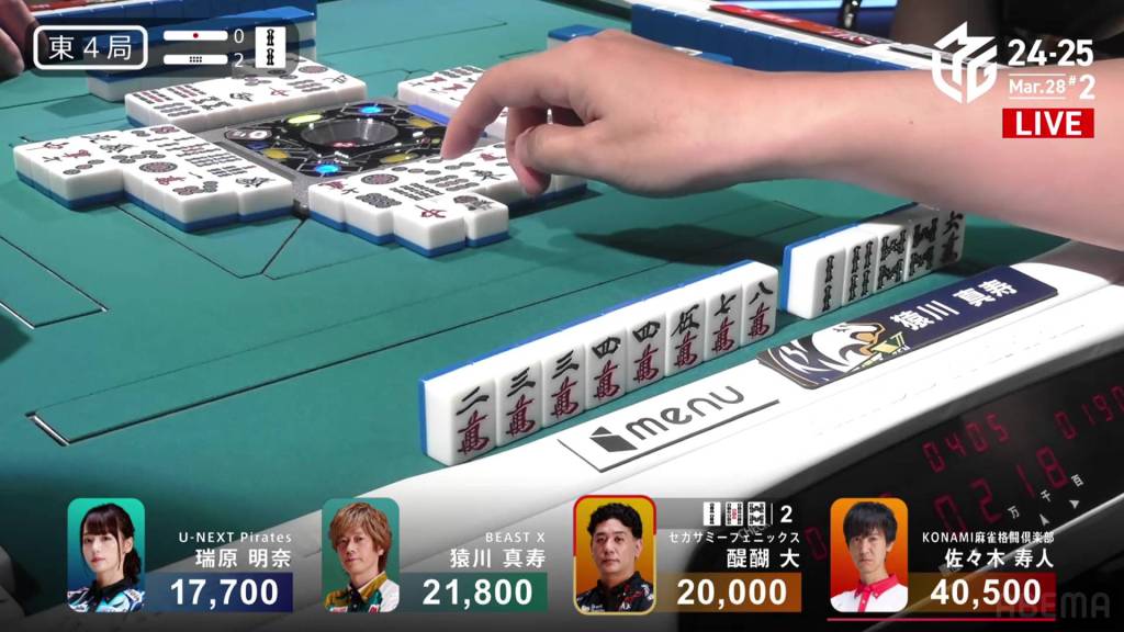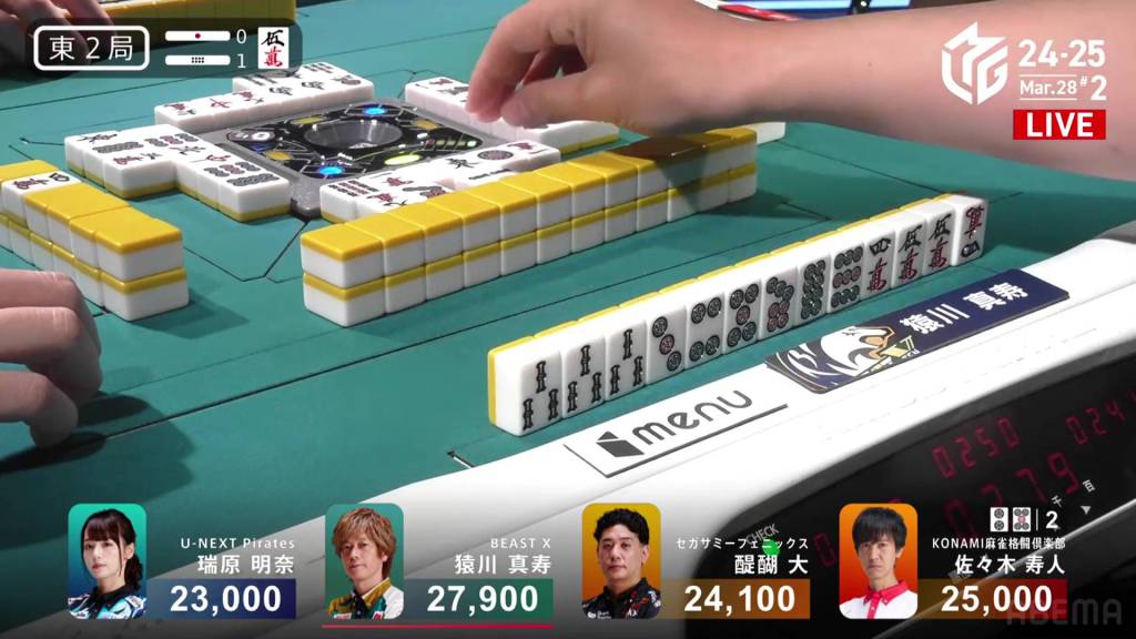In 2nd place, Daigo is 19,400 behind 1st place Hisato. If Daigo gets a haneman direct hit, a baiman tsumo, or a sanbaiman win, he will finish the game in 1st place and become the next M-League MVP.