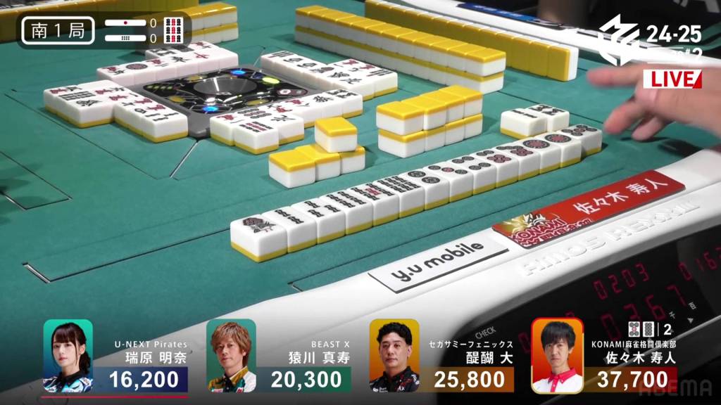 In S3-1, Genta is in 4th place and 13,200 behind 3rd place Nakabayashi and 15,500 behind 1st place dealer Nakada. To get within range of 1st place, he needs to win at least a mangan.