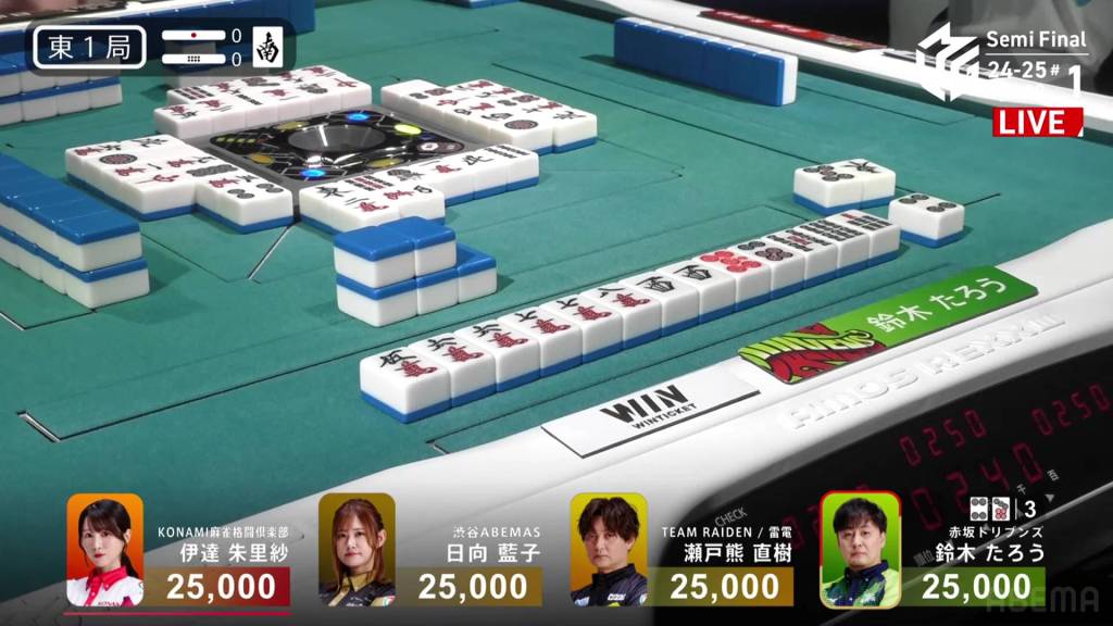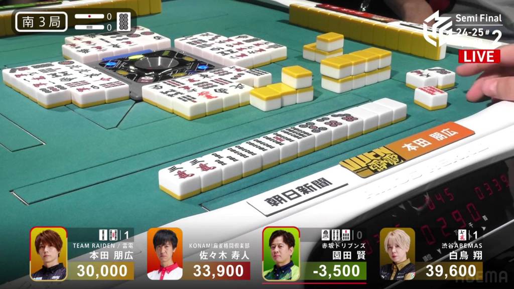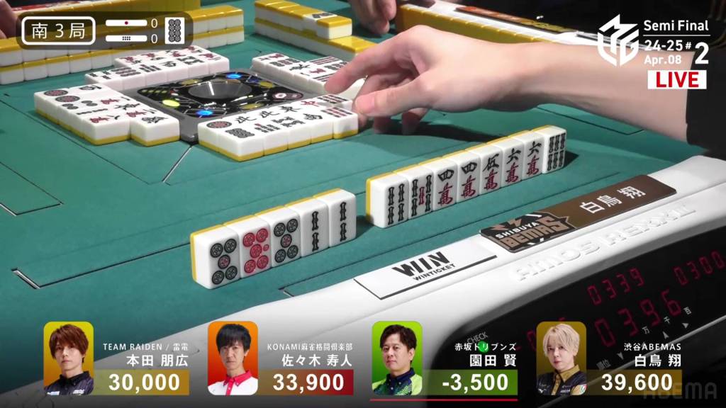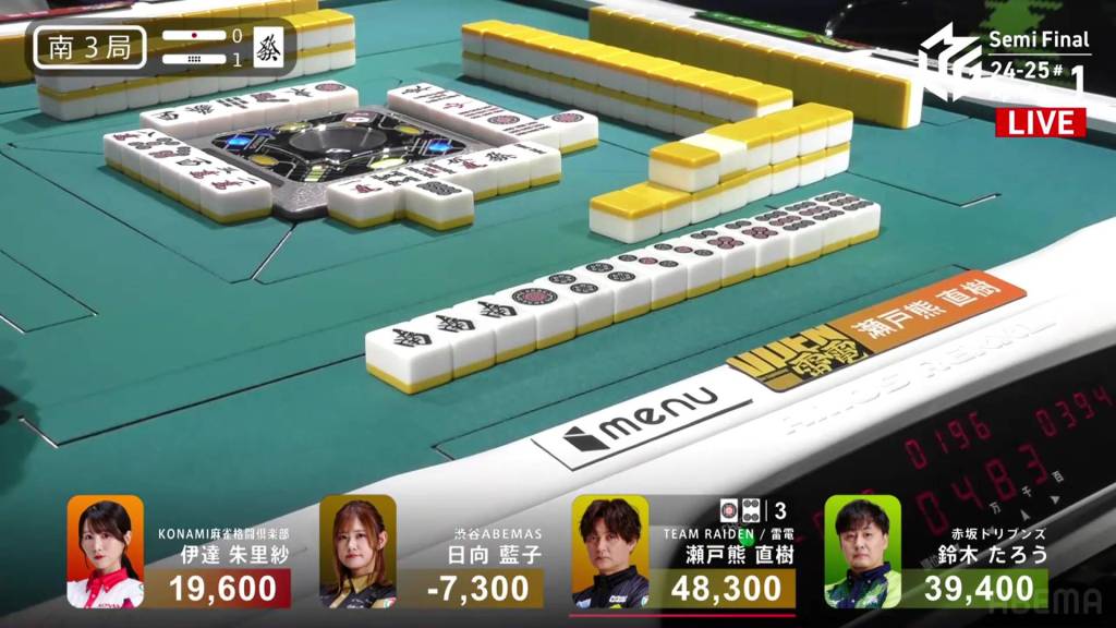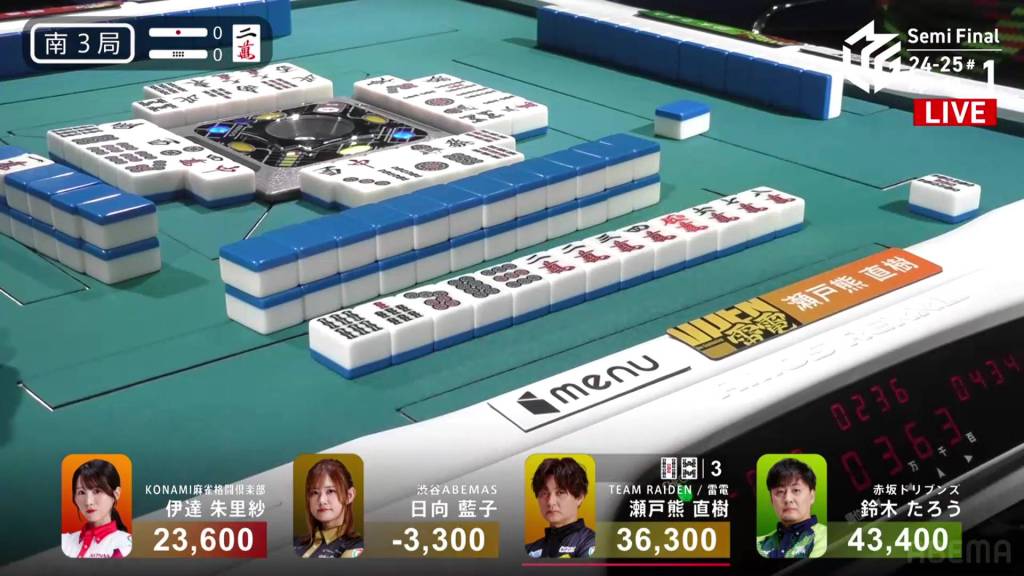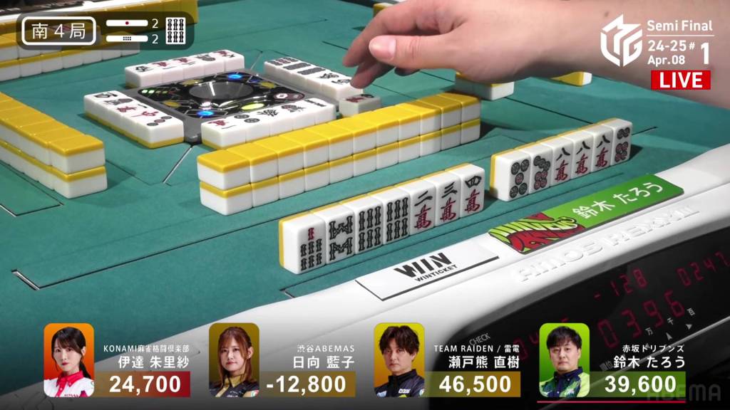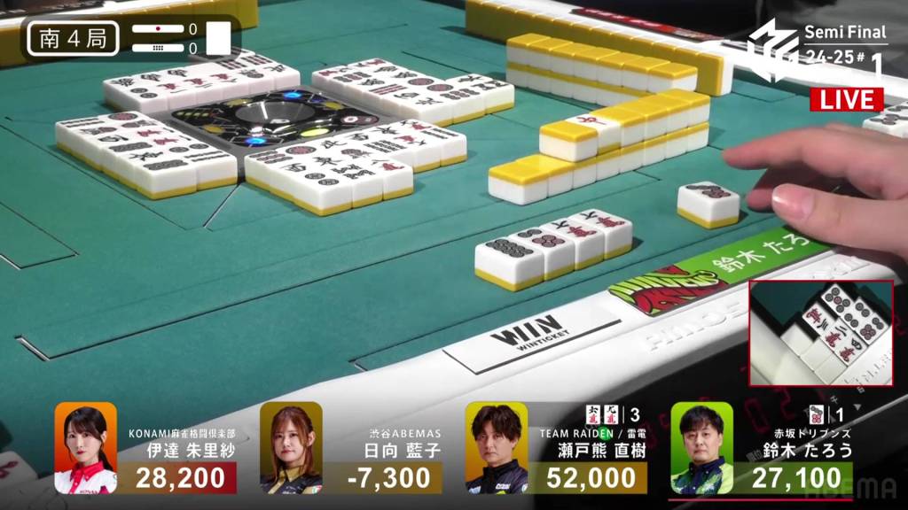 In S3-0, Setokuma is the dealer in 2nd place, 7,100 behind 1st place Taro. It has been quite the back and forth battle between the two of them.