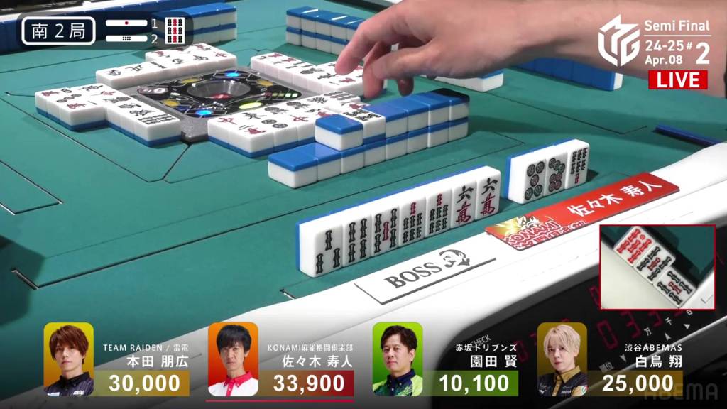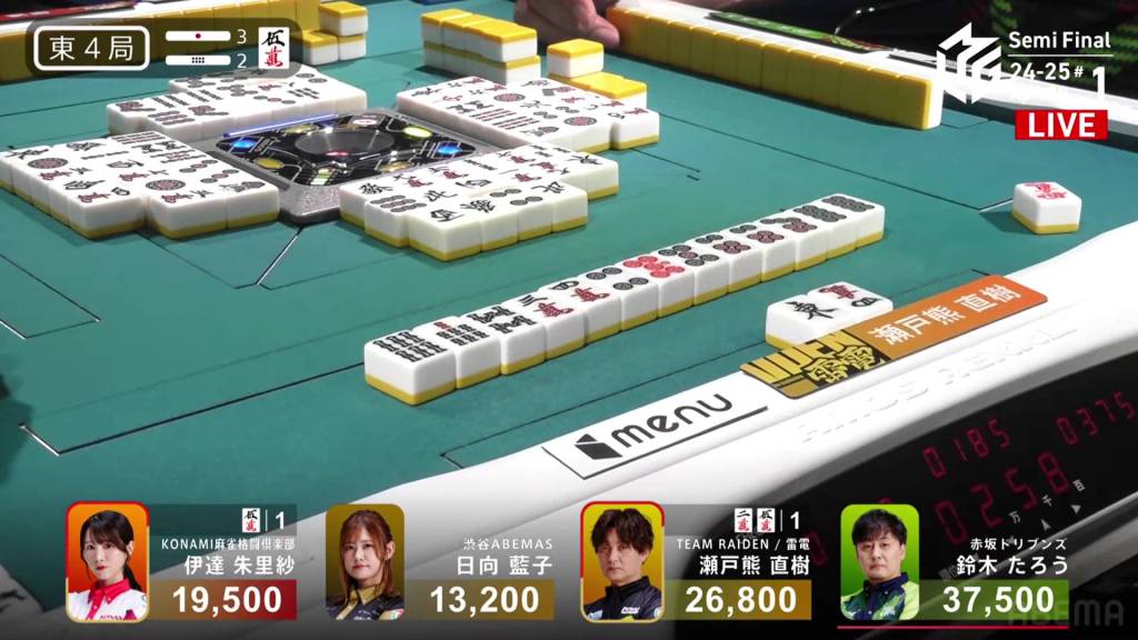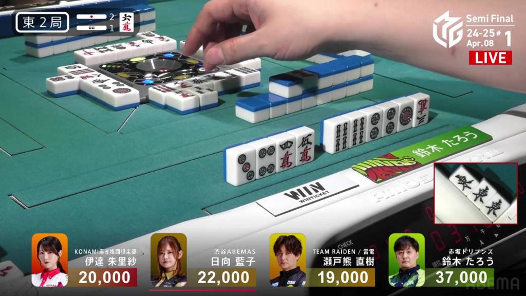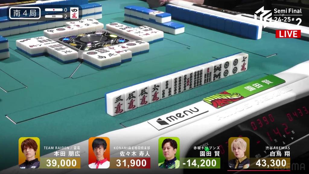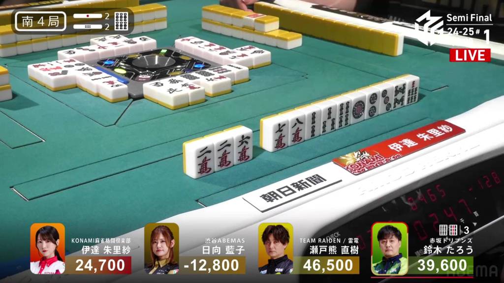 Jumping to E4-2, Setokuma is in 2nd place and 10,700 behind 1st place Taro. Three riichi sticks and two honba are in the pot, meaning a mangan will be enough for 1st place.