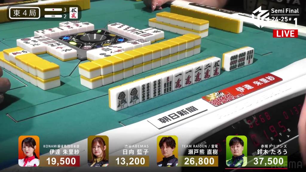 In S4-2, the scores are close at the top. Sitting in 3rd place is Hisato, 7,100 behind 2nd place Honda and 11,400 behind 1st place dealer Shiratori. With a mangan tsumo or a haneman ron, Hisato would finish the game in 1st place.
